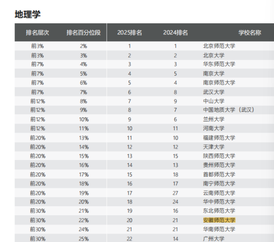 2025年10月15日,高等教育评价专业机构软科正式发布“2025软科中国最好学科排名”。安徽师范大学地理学学科以优异表现位列全国第20名,师范类高校第12名。排名连续跻身全国前30%行列,综合排名较去年提升1个名次。这是我校地理学学科排名首次进入全国前20名行列。