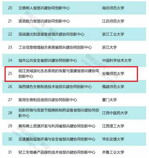 参与申报的“皖江流域退化生态系统的恢复与重建省部共建协同创新中心”获批建设。这是安徽省属高校第一次获批的省部共建协同创新中心。“皖江流域退化生态系统的恢复与重建省部共建协同创新中心”主要依托于我校生命科学学院和生态学博士学位授权一级学位点建设,协同化学与材料科学学院、足探比分