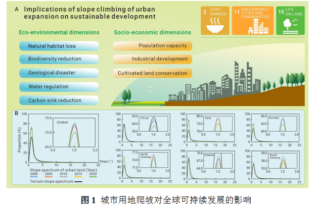 城市用地爬坡是土地利用冲突的一种特殊空间表现形式,其在空间上表现为城市用地向坡度更大的地区发展;这一过程虽然拓展了城市发展空间,提高了城市人口和经济容量,但也可能导致自然与半自然栖息地丧失和地质灾害频发等不利影响。近年来,施开放副教授研究小组聚焦于城市化进程中人类社会经济活动的多维表征,发展了面向多源遥感的城市用地爬坡影响过程与效应分析的理论与方法,取得了以下研究成果。