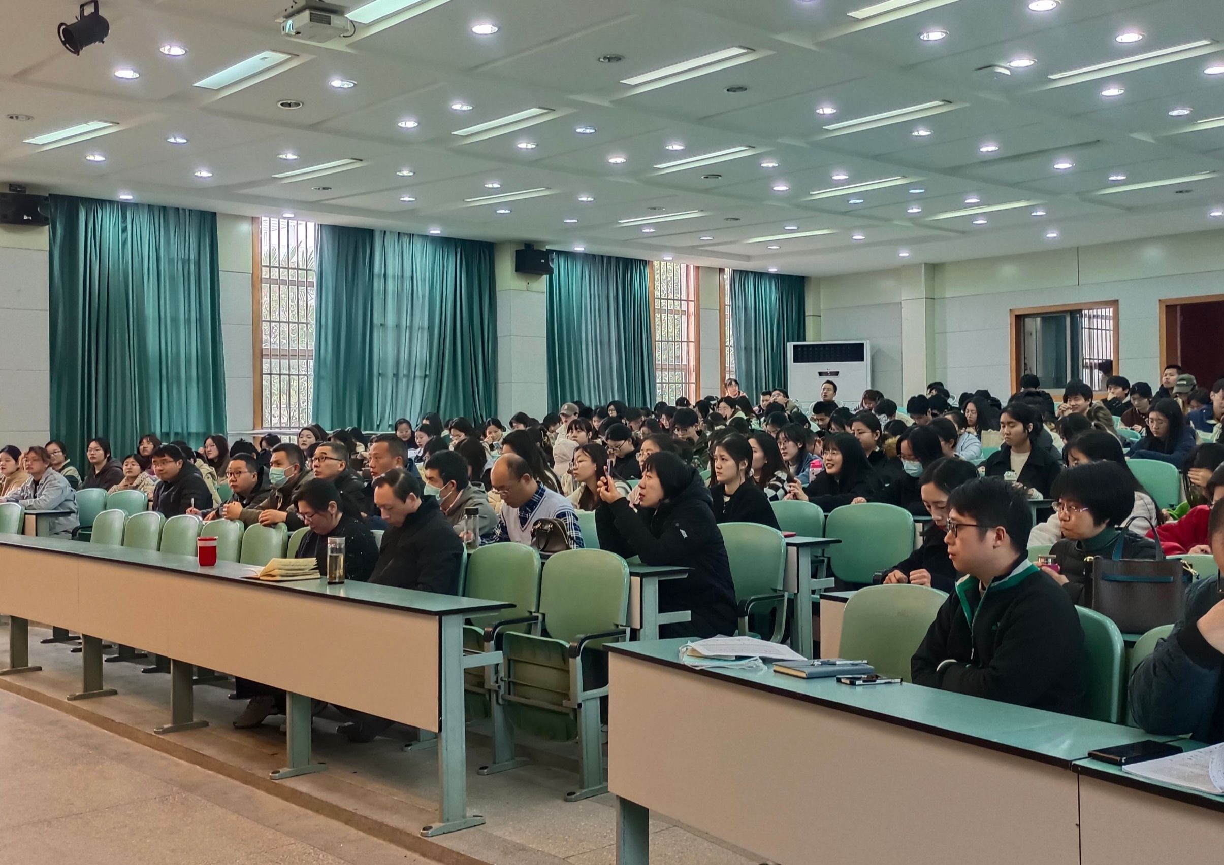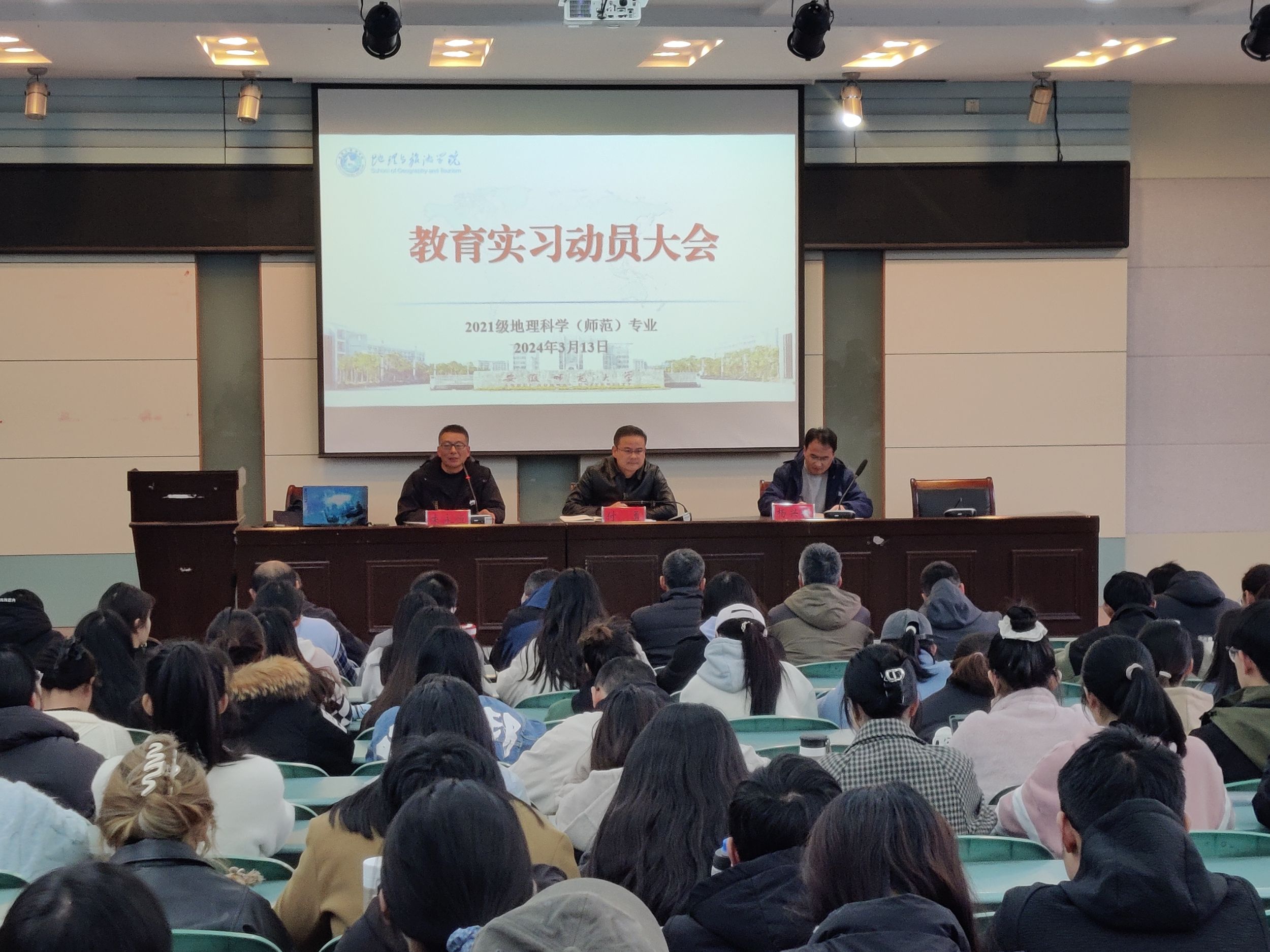 于实验楼101报告厅举行教育实习/研习动员大会,学院党委副书记付勇、副院长杨兴柱、地理专业负责人朱永恒、全体实习指导老师及21级地理科学(师范)专业学生参会。