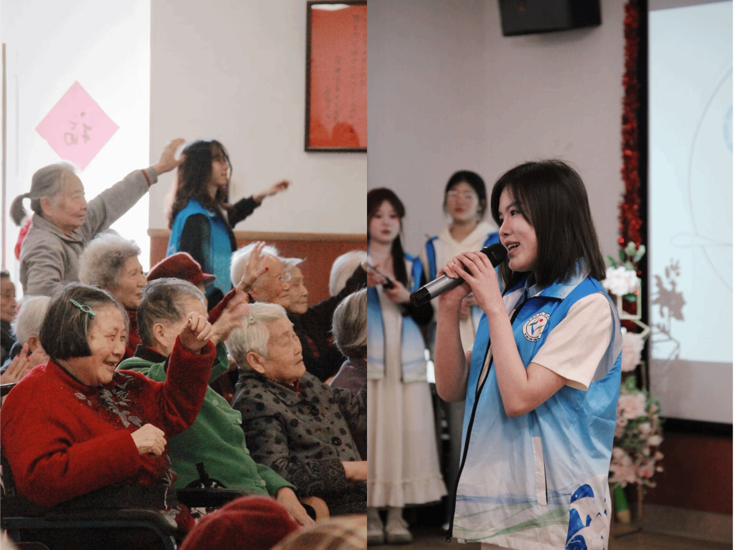 在这个阳光明媚的日子里,志愿者们怀揣满满的热情与爱心来到敬老院。活动伊始,所有志愿者共同向爷爷奶奶们自我介绍、问好,让爷爷奶奶们感受到青年们的蓬勃朝气。在短暂的交流后,首先由江南诗社的吴瑞睿,牛思涵,洪香草,江子澂四位志愿者为大家带来了激情澎拜的诗歌朗诵《我爱你,中国》。而后,爱心者协会的姚红志愿者用她那精彩的表演——《武家坡》让现场更为活跃。最后由江南诗社的雷磊、王光甫、杨靖、吴凡四位同学再次献上充满气势的诗歌朗诵《长江之歌》。老人们享受着这一场场精彩纷呈的演出,在志愿者们的朗诵与表演中感受年轻的活力。