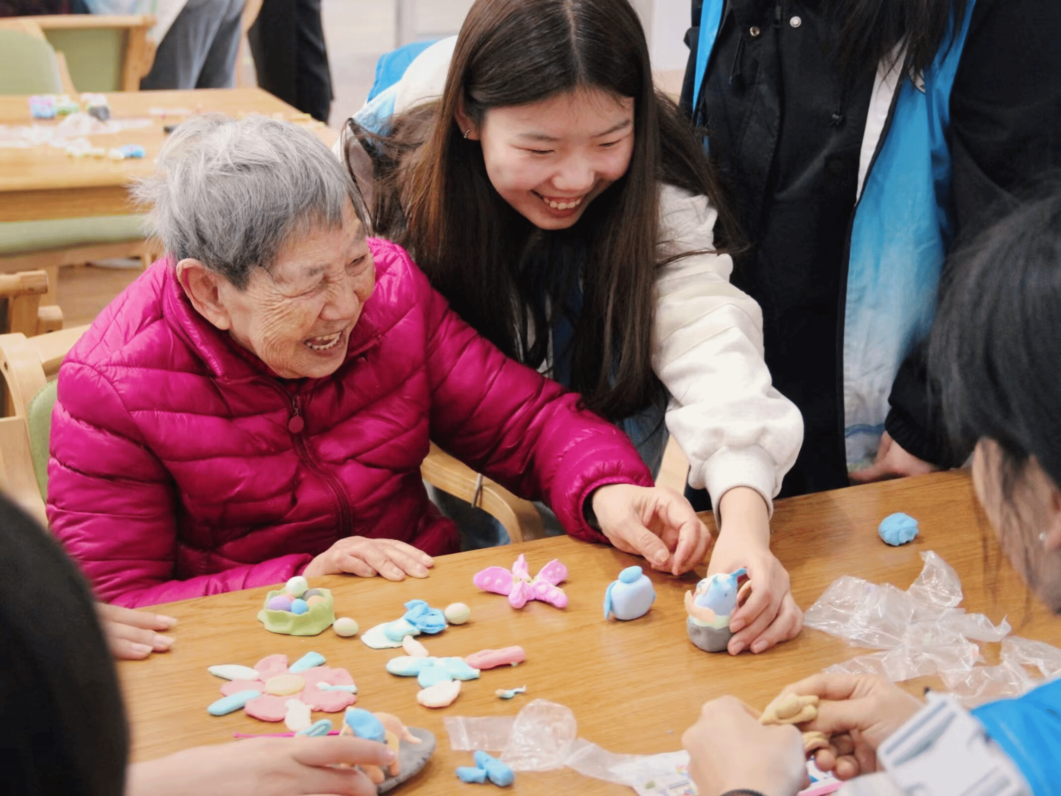 图为志愿者陪老人捏粘土