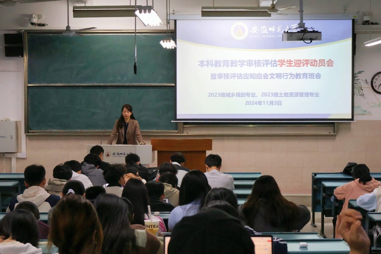 2023级城乡规划和2023级土地资源管理专业在2050303教室召开了深化大学生“六个文明”教育实践专项活动主题班会及本科生教育教学评估学生迎评动员大会。本次会议由辅导员李婷君主持,2023级城乡规划和2023级土地资源管理全体同学参加。