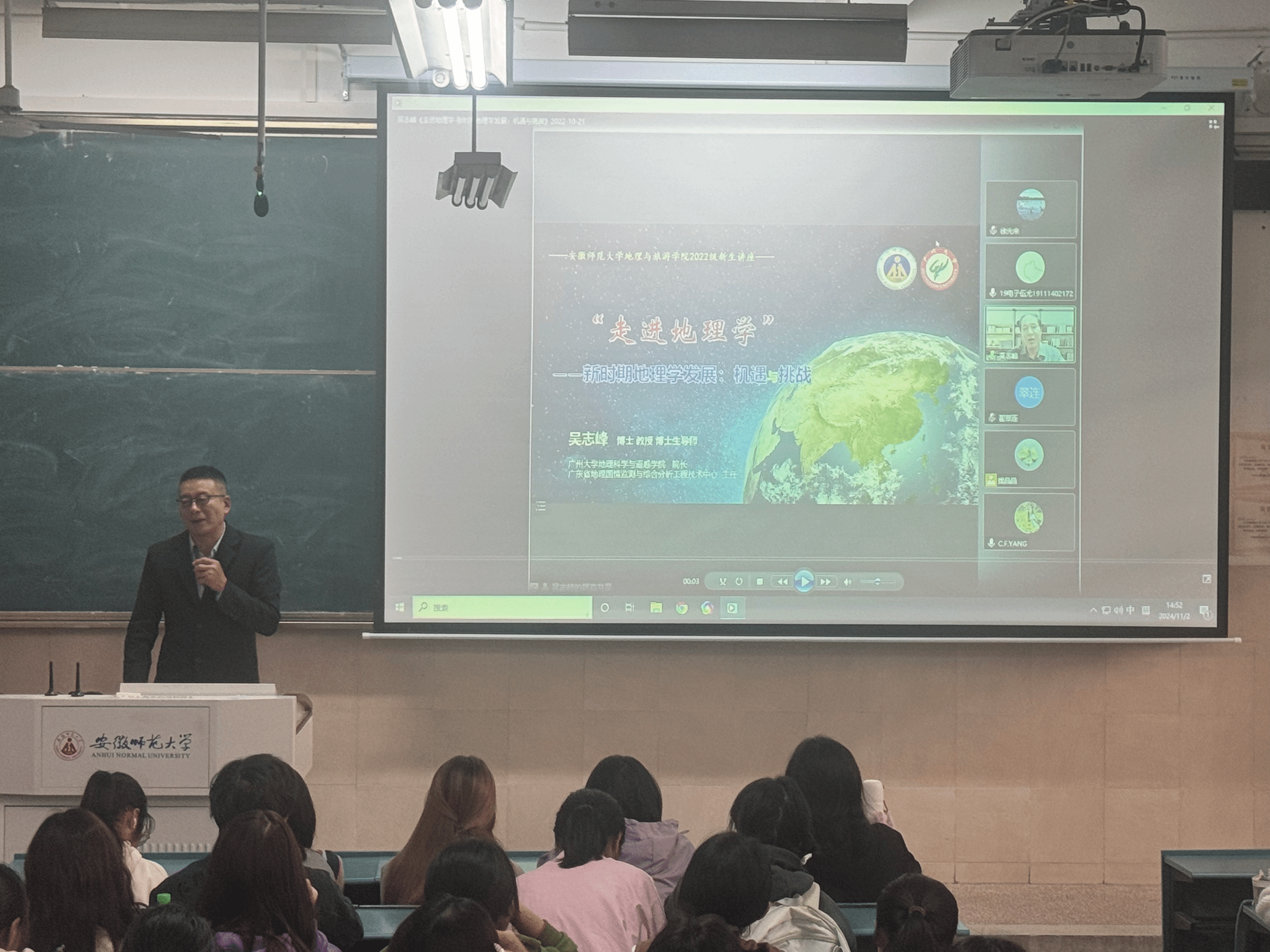 最后,朱老师为同学们播放了一段由广州大学地理科学与遥感学院院长吴志峰主讲的讲座视频。吴教授指出,在新的时代背景下,地理科学的地位已经日益凸显。在面对诸多时代问题中,自然地理、人文地理、信息地理共同发力,为解决时代问题提供了一定的理论性和实践性指导。在提及中学地理教育的时候,吴教授说,现如今我们的地理学的高中教育和大学教育存在一定的隔阂,希望同学们终有一日走上讲台的时候,努力做改革的急先锋,为地理科学的发展贡献出自己的一份力量。
