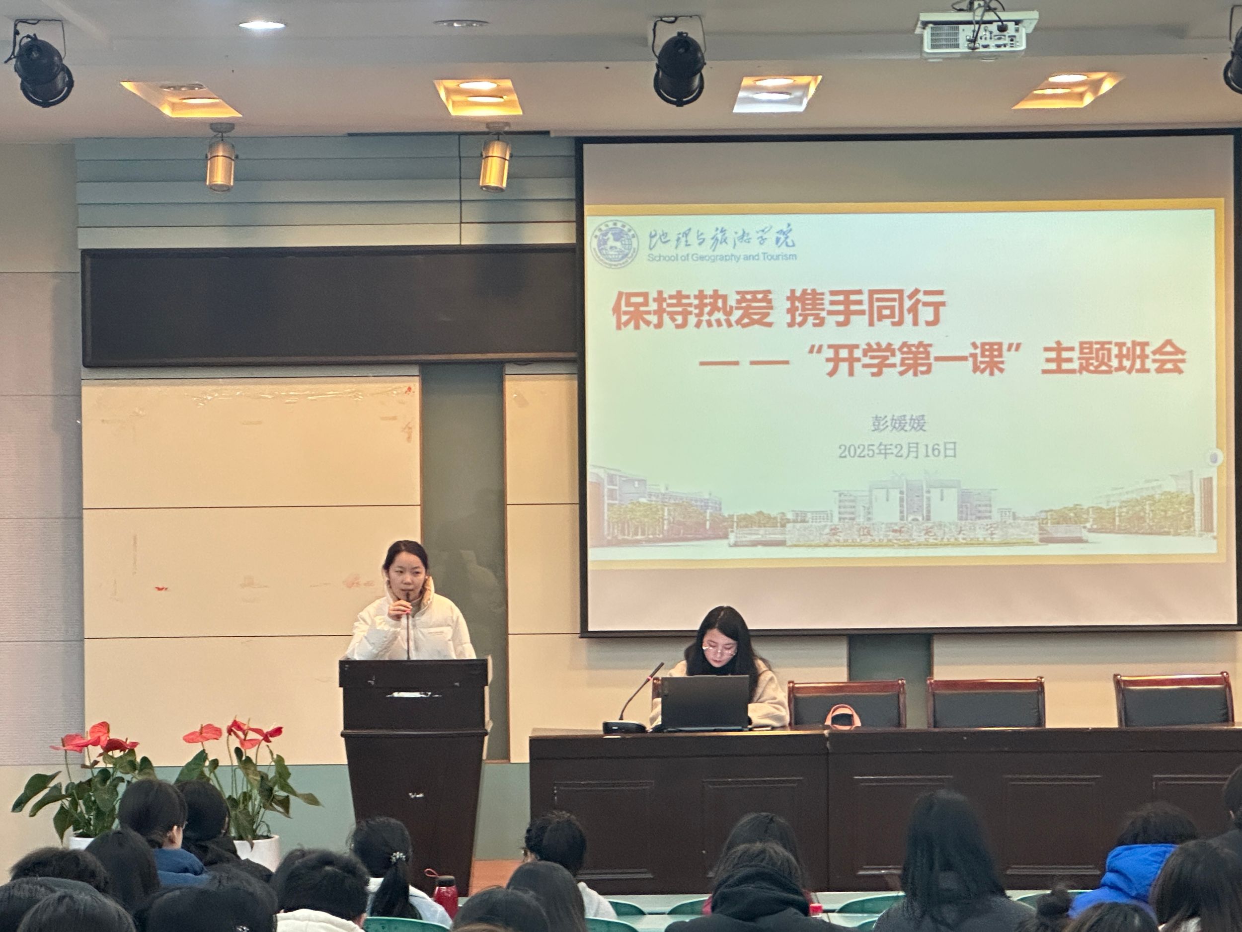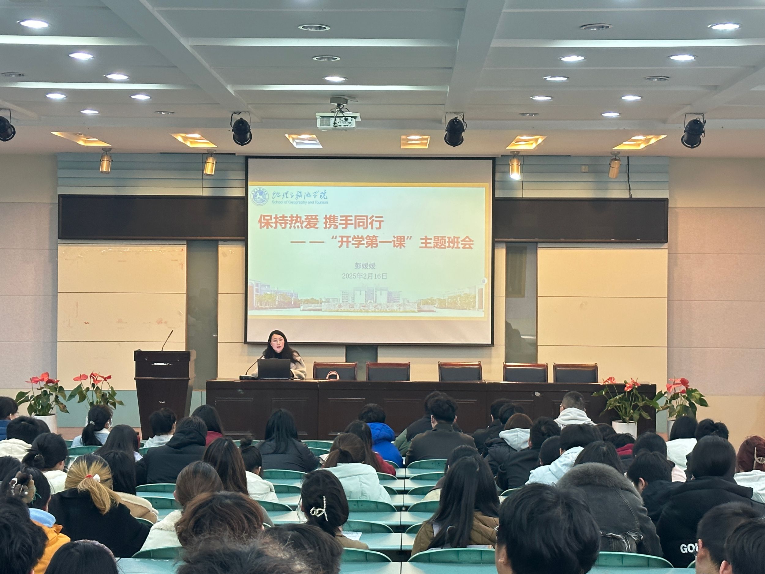 实验楼101报告厅召开以“保持热爱,携手同行”为主题的开学第一课主题班会。会议由辅导员彭媛媛主持,全体学生参加。