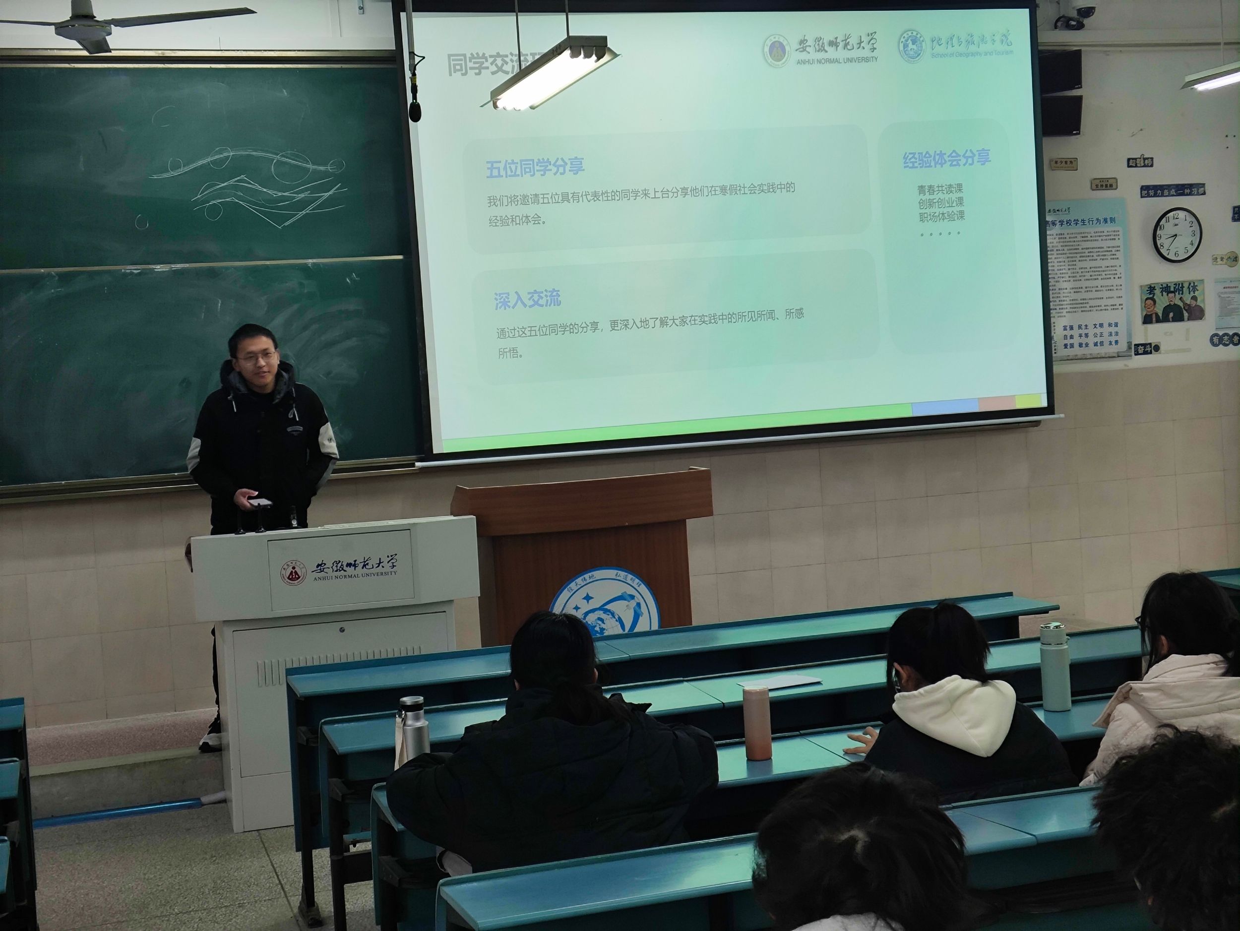 (本稿讯 赵毅衡)2025年2月21日上午,23级地理信息科学(1)班在行知楼4号楼303教室成功举办寒假社会实践成果分享会。活动以“实践砺青春,奋斗正当时”为主题,全班43名同学齐聚一堂,通过成果展示、经验分享等形式,共同回顾寒假社会实践的精彩历程,展望未来实践方向。会议由赵毅衡主持,辅导员吴楠全程参与聆听。