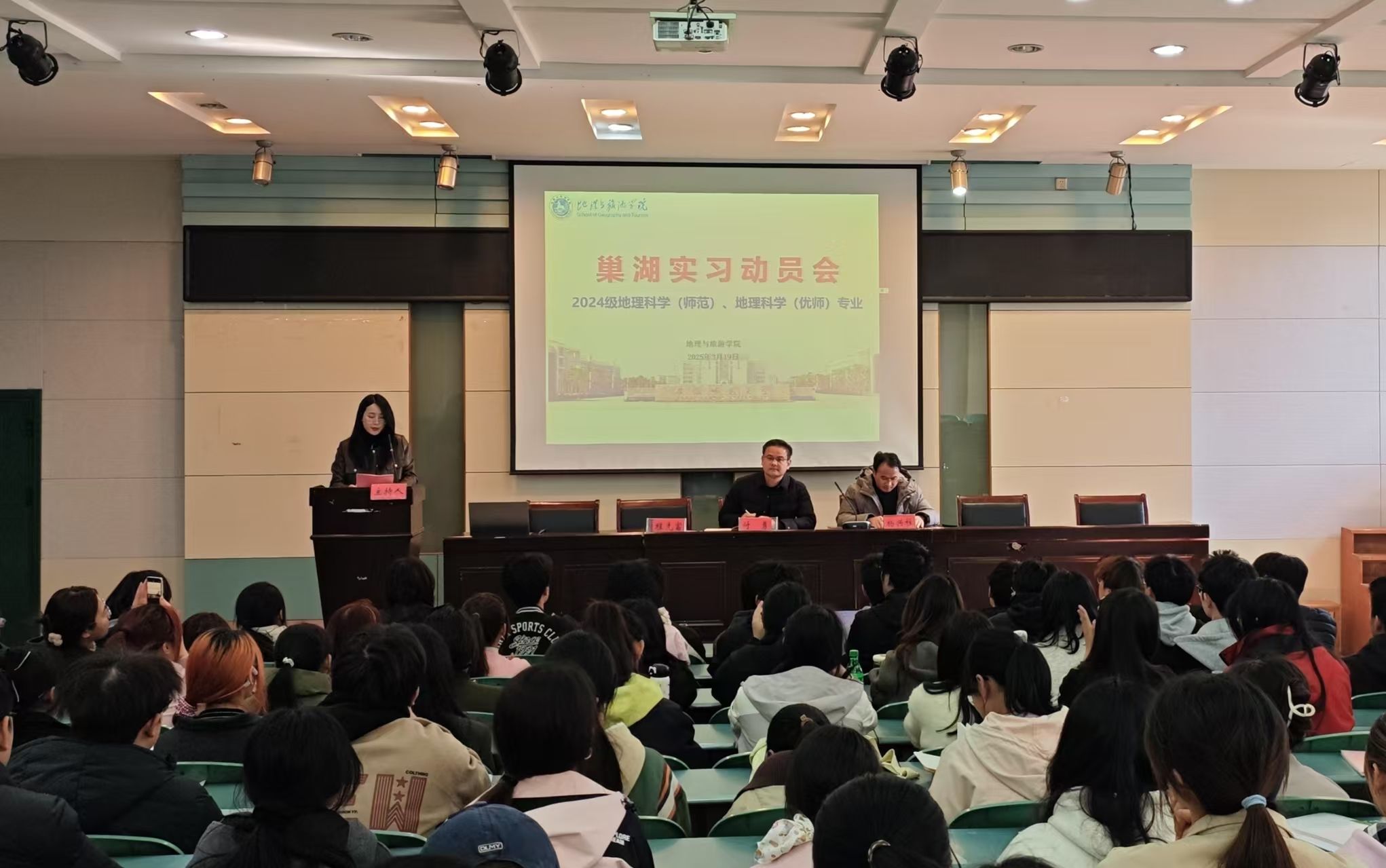 召开巢湖实习动员大会,会议由辅导员彭媛媛主持,学院党委副书记付勇,副院长杨兴柱,实习指导老师程先富、杨立辉、吴立、朱晓强等出席会议,2024级地理科学(师范)、地理科学(优师)专业全体学生参加会议。