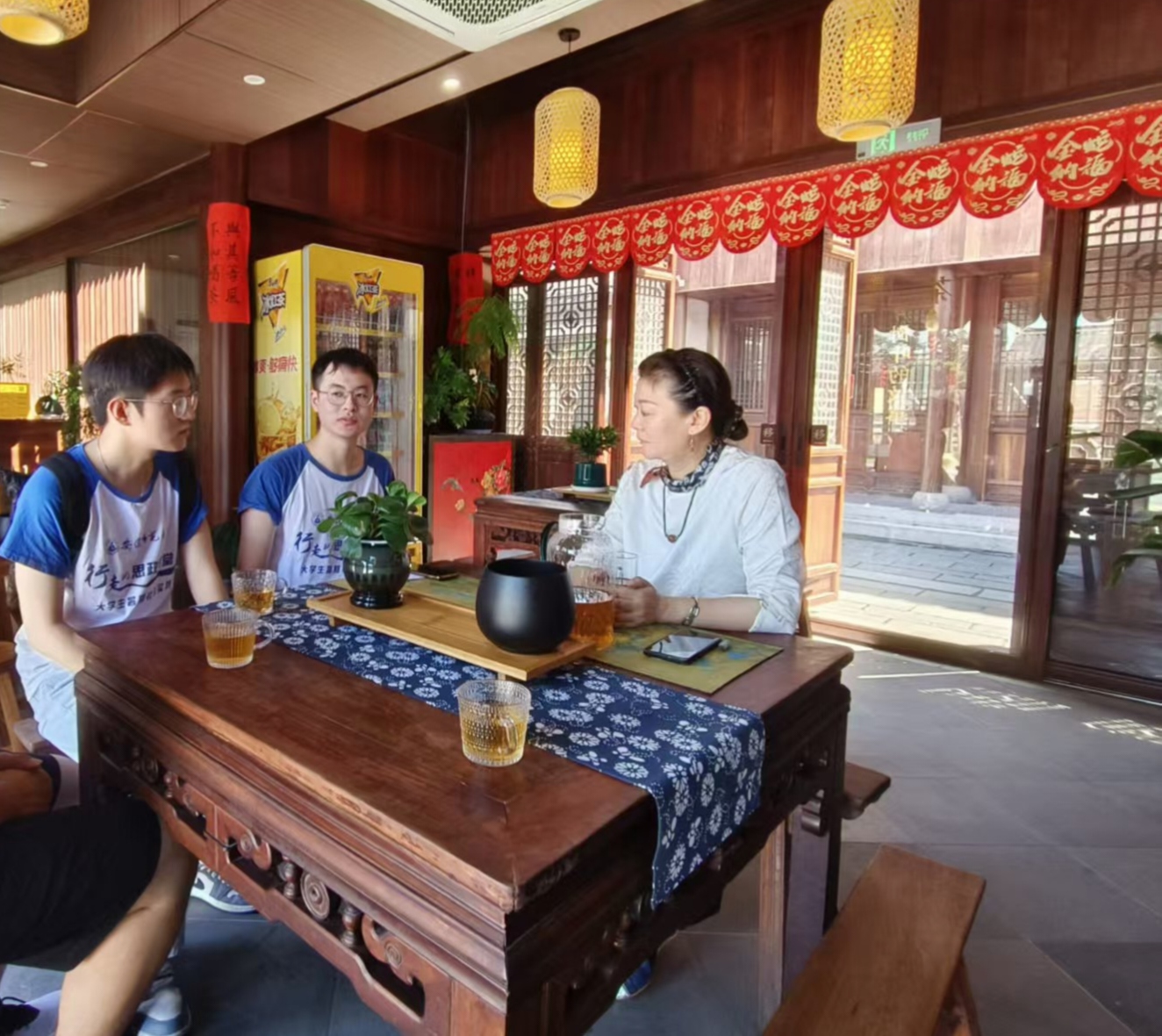赴宣城探究文旅融合驱动下河沥溪街道活化机制调研本科实践团到达当地著名的河沥溪街道祥源茶馆,向茶馆老板了解了河沥溪街道旅游发展的当前现状和未来潜力。