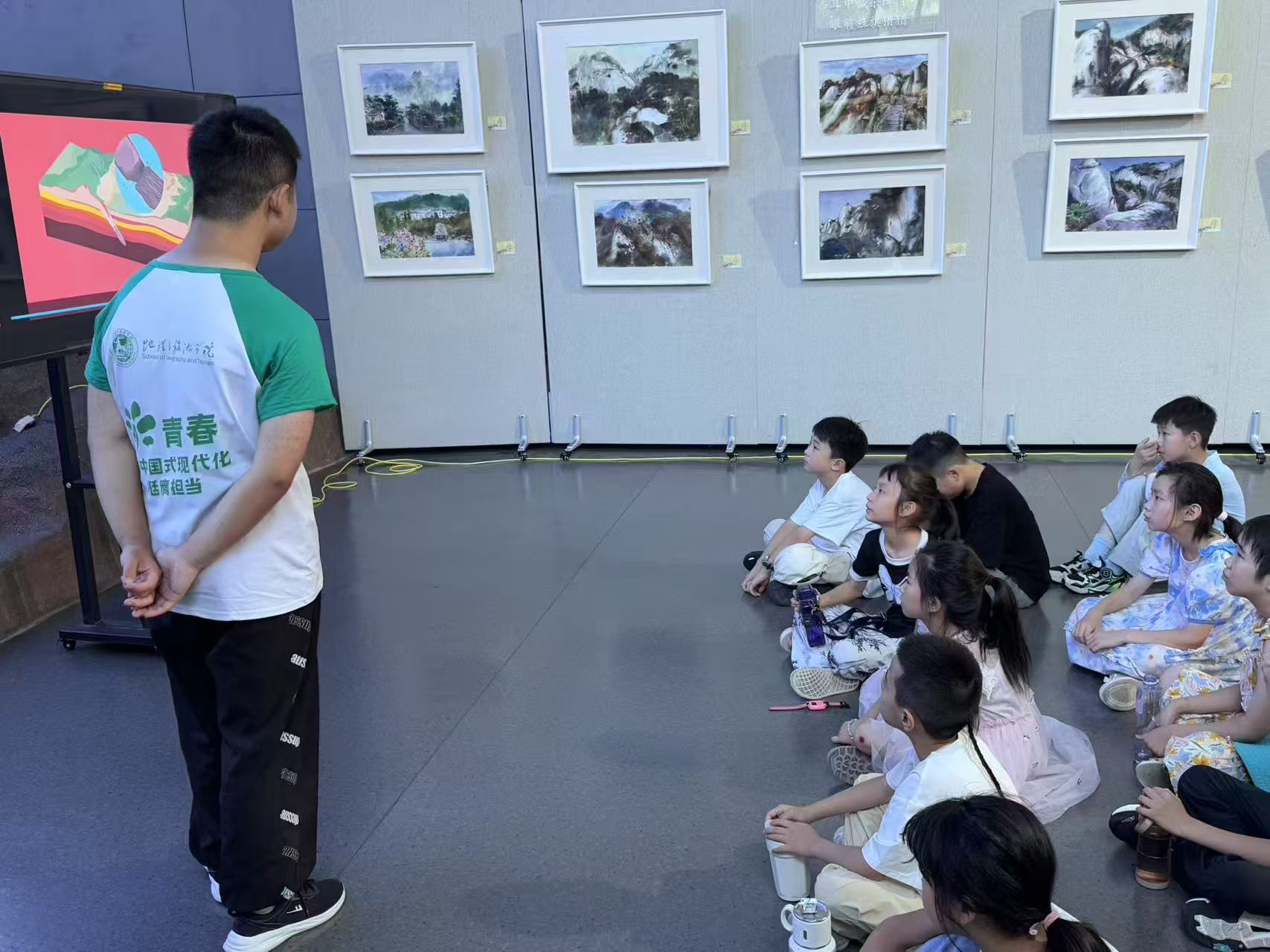 活动伊始,实践团队成员通过精美的图片和通俗易懂的语言,向小学生们介绍了天柱山的形成过程、独特的地质构造以及丰富的地貌景观。在讲解过程中,团队成员们还巧妙地穿插了互动问答环节,“大家知道天柱山的主峰有多高吗?”、“花岗岩是怎么形成的呢?”……一个个有趣的问题激发了孩子们强烈的好奇心,现场气氛热烈,小学生们纷纷举手抢答,稚嫩的声音中充满了对知识的渴望。