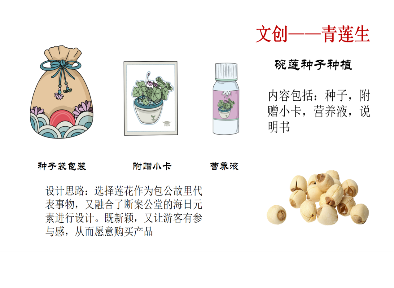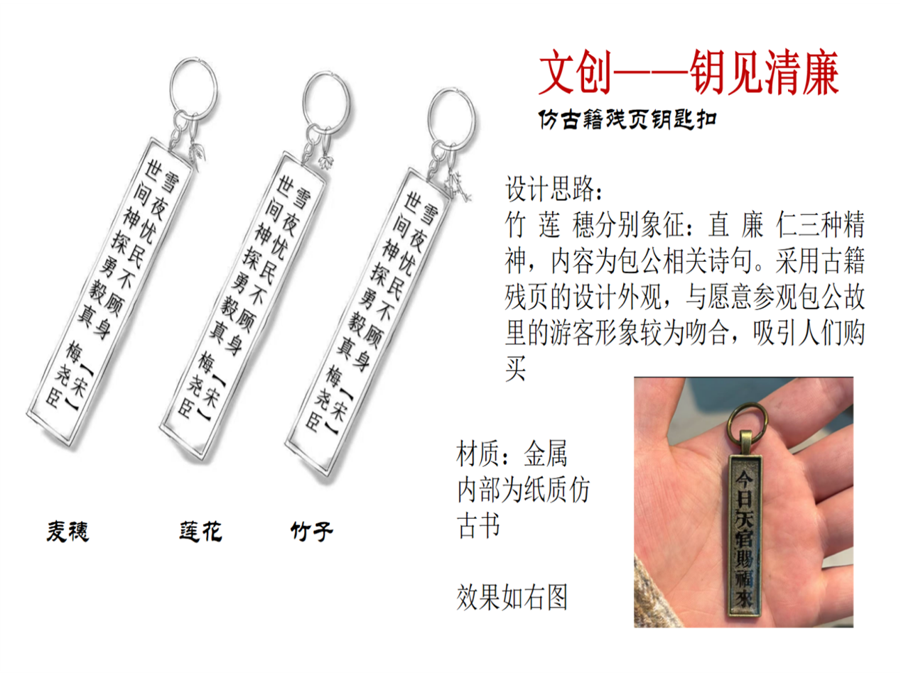 结合考察成果,团队构思了系列文创产品方案:“青莲生”系列以碗莲种植套装为载体,让游客在种植中感受参与乐趣;“青天正气”系列用“青莲”“云朵”“直竹”等意象,通过“器物隐喻精神”,设计兼具实用性与艺术性的冰箱贴和金属徽章等;“映日笺”系列将文化园标志性建筑与包公诗词相结合,开发具有纪念意义的打卡明信片和拍照工具;“钥见清廉”系列采用古籍残页的设计外观,以竹、莲、穗象征直、廉、仁三种精神,制作出赋有古诗词的钥匙扣;推出“包公形象”主题互动盲盒,融入历史典故,增强趣味性和教育性。