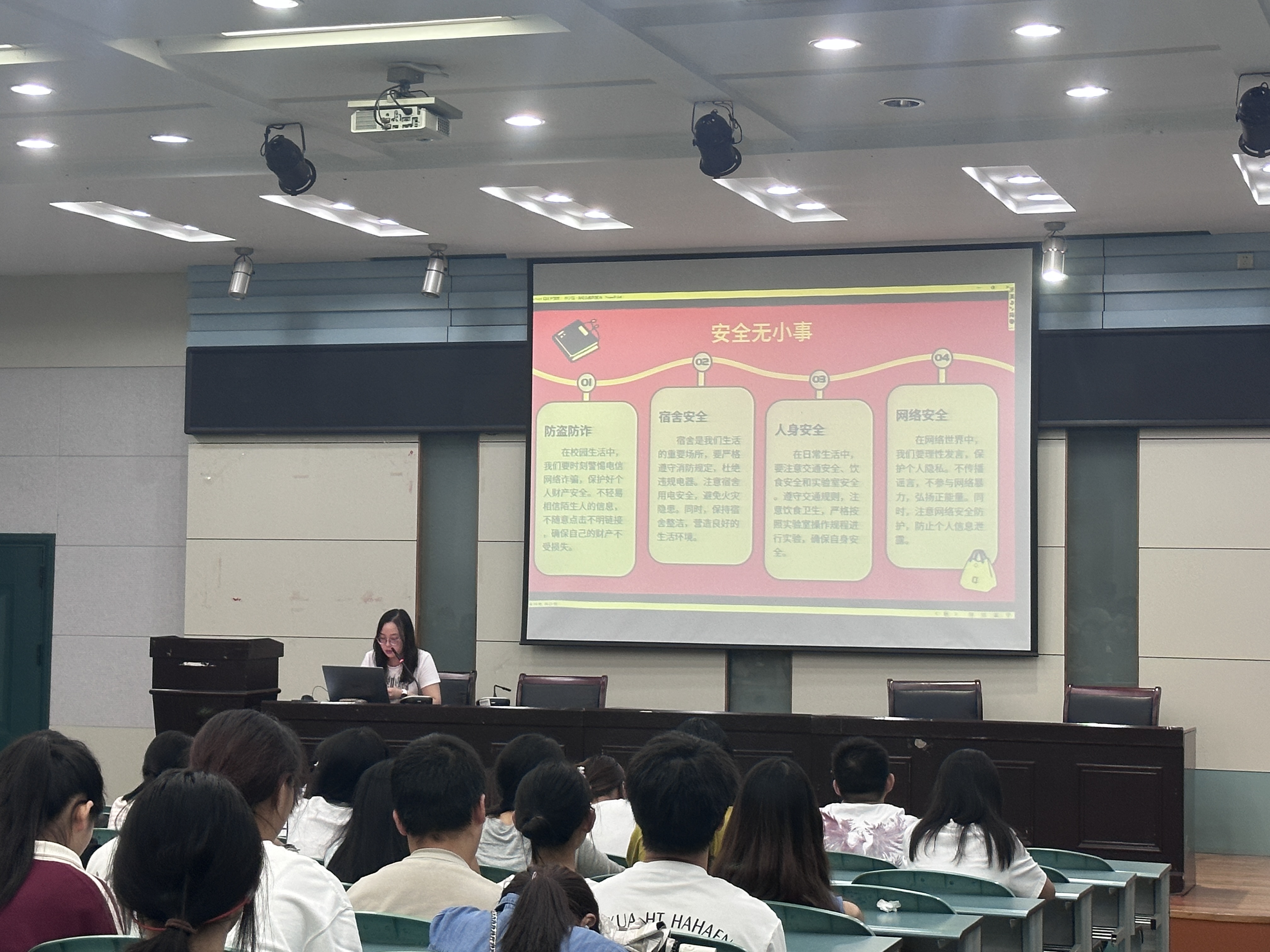 安全教育是本次班会的另一核心议题。辅导员彭媛媛与章怡晨在网络安全、交通安全、用电安全、饮食安全、人身财产安全、实验室安全、身心健康等多方面利用典型案例进行了警示教育,并且重申了多方面安全要求:在网络安全上,提醒同学们警惕电信网络诈骗,加强个人隐私保护,严防信息泄露;在宿舍安全上,强调“人走断电”,严禁违规用电和使用违规电器,构建文明宿舍;在身心健康上,呼吁大家保持乐观向上的心态,“读书、交友、运动”,及时调节情绪,共同营造良好班风学风。此外,她们也强调同学们要树立正确的宗教观,自觉抵制非法宗教和邪教活动。