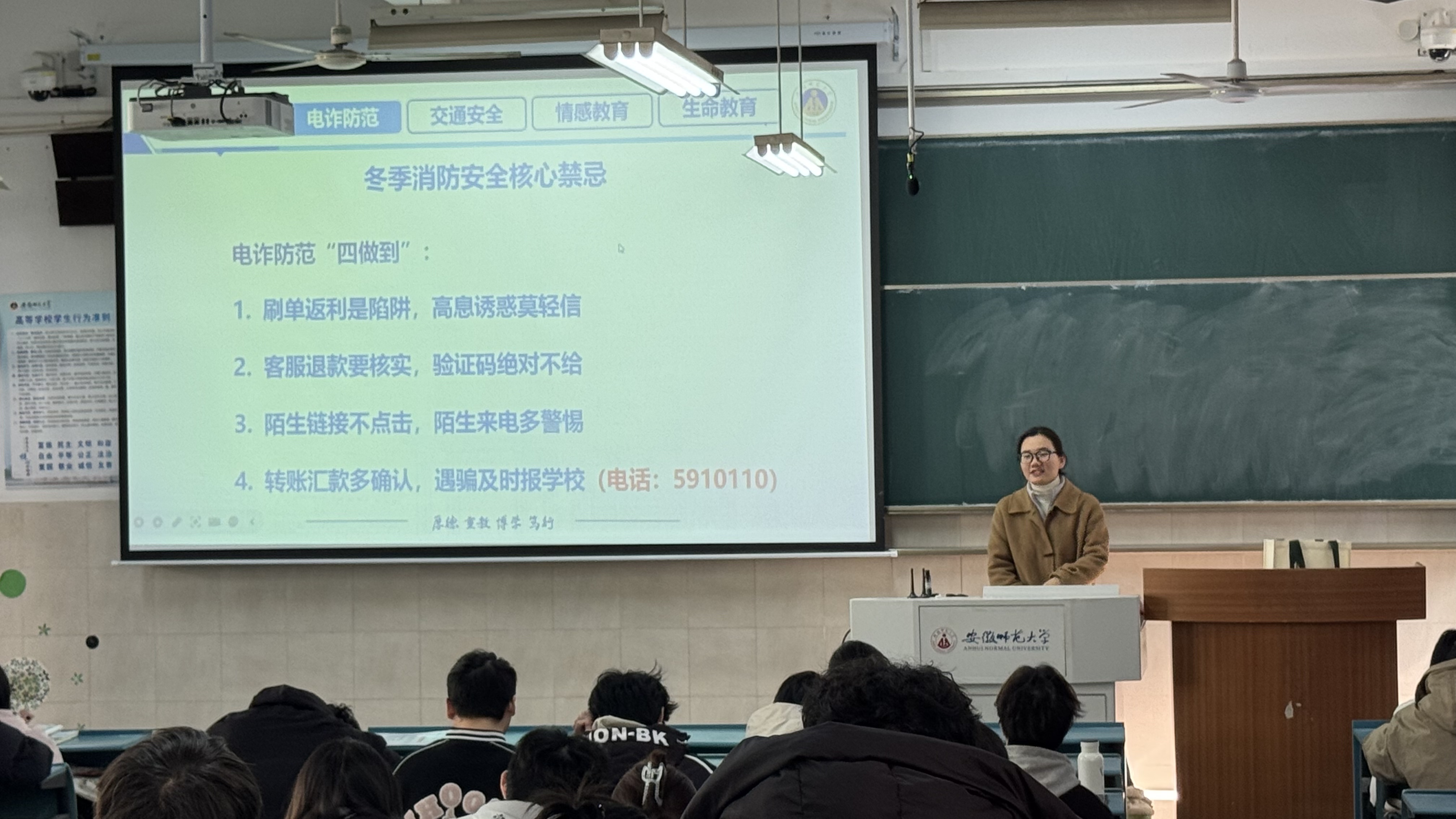 班会内容全面,聚焦多个安全维度。消防安全方面,通过触目惊心的全国高校火灾案例和数据,警示违规电器的巨大危害,明确了宿舍用电的“核心禁忌”,并讲解了初起火灾的应对方法。防范电信诈骗方面,结合我校近期发案数据与典型骗局,深入剖析了“刷单返利”、“客服退款”等针对学生群体的陷阱,总结了“四做到”防骗口诀,同时强调了“翻墙”为违法行为,对同学们国家安全意识培养、文明用网进行了教育。