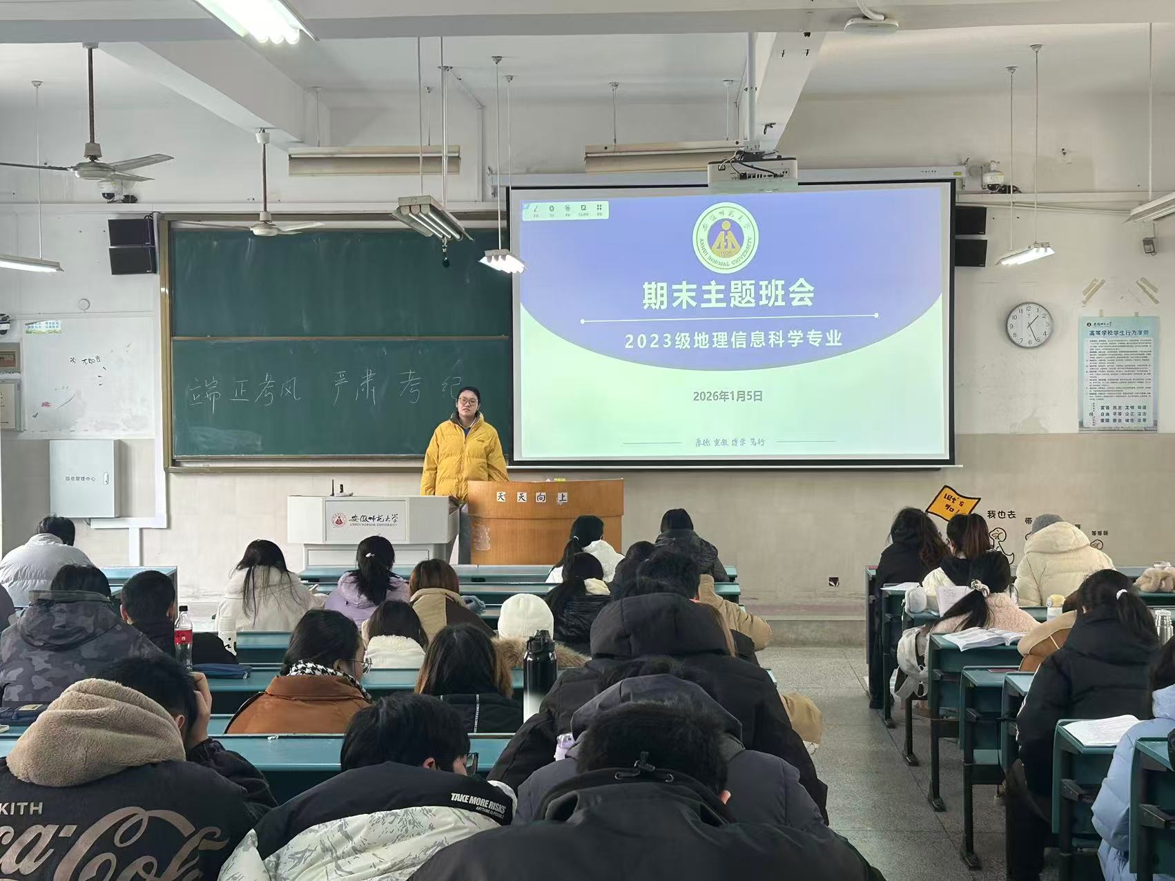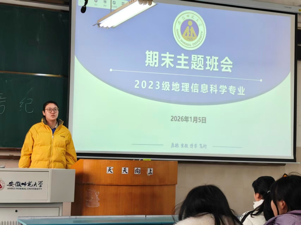 1月5日下午,2023级地理信息科学专业期末主题班会在行知楼2030303教室顺利召开。班会由辅导员吴楠主持,围绕诚信考试、假期安全及合理规划等方面展开说明。