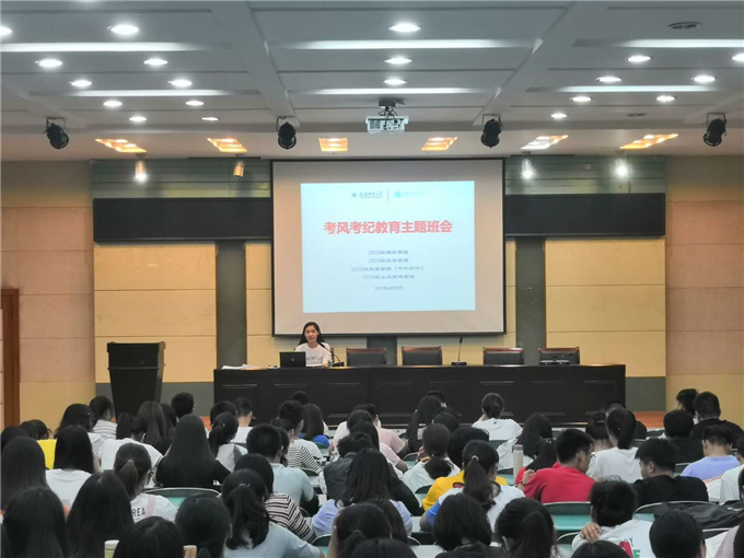 实验楼101报告厅举行考风考纪主题教育班会。2018级酒店管理、旅游管理、旅游管理(中外合作)、土地资源管理专业全体188名同学参与此次会议,会议由辅导员陈祥云主持。
