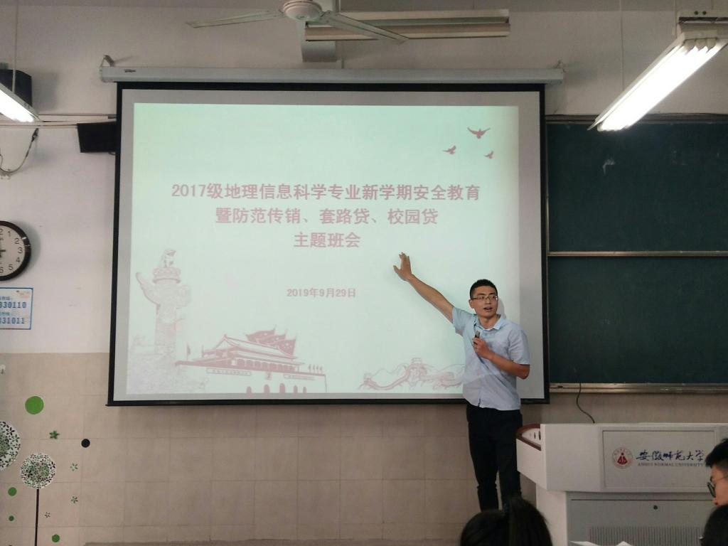 章莹莹)为严防传销非法活动进入校园,维护校园的安全稳定,提高学生的辨别能力,保护学生的身心安全和财产安全,2017级地理信息科学专业于9月29日上午在行知楼2040303组织召开了新学期安全教育暨防范传销、“套路贷”、“校园贷”主题班会。会议由辅导员韩红豆主持,班级全体同学参与。