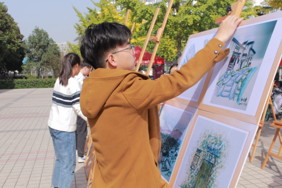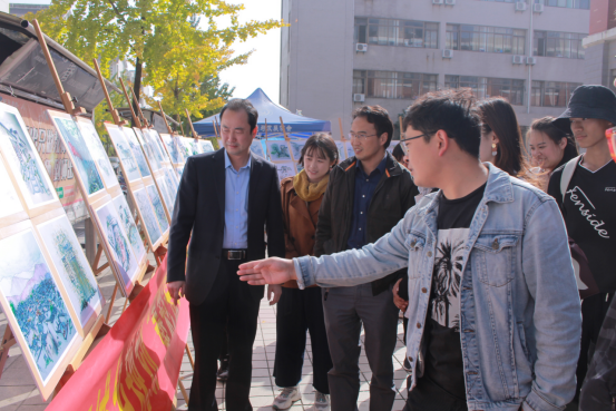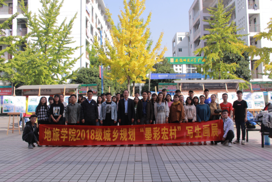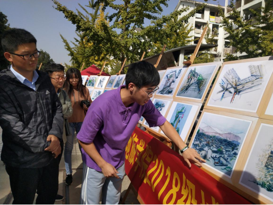 潘爽)为展现2018级城乡规划大一学习成果,促进各专业间的交流学习,2019年10月30日,2018级城乡规划专业于二食堂门口举办“墨彩宏村”写生作品展。院党委副书记乔静,城乡规划专业负责人杨兴柱,美术学院教师鲍涛,专业任课老师黄秋实、张晨阳,辅导员王阳赴现场参观画展。