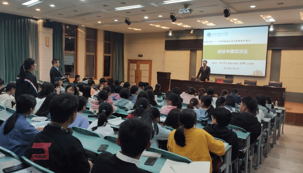 2019级旅游管理类专业举办“经纬讲坛”—2019级新生专业思想教育报告:旅游饭店业的发展及现状专题报告。2004届旅游管理专业优秀校友张坤(现任海宁开元名都大酒店总经理)重返母校,就旅游饭店业的发展及现状,为2019级旅游管理类专业学弟学妹们上了生动而精彩的一课。