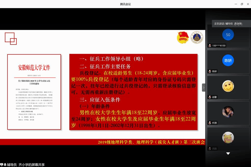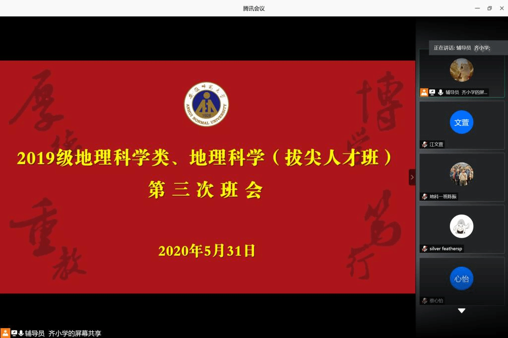 江文萱 齐小学)5月31日晚,2019级地理科学大类积极利用腾讯会议网络平台,顺利举行本学期第三次班会暨大学生应征入伍动员会。2019级地理科学类、地理科学(拔尖人才班)全体同学参加会议,会议由辅导员齐小学主持。