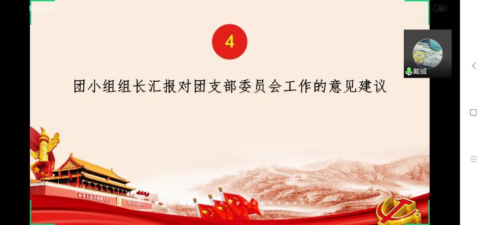 接着,团员青年代表线上交流发言,分享自己在疫情期间的学习生活心得与感想,情感真挚,内容丰富。吴浩泽汇报了支部教育评议工作情况与团员的建议评议等次,选读班级优秀团员、合格团员和不合格团员的人数与名单。随后,团小组组长汇报对团支部委员会工作的意见建议。
