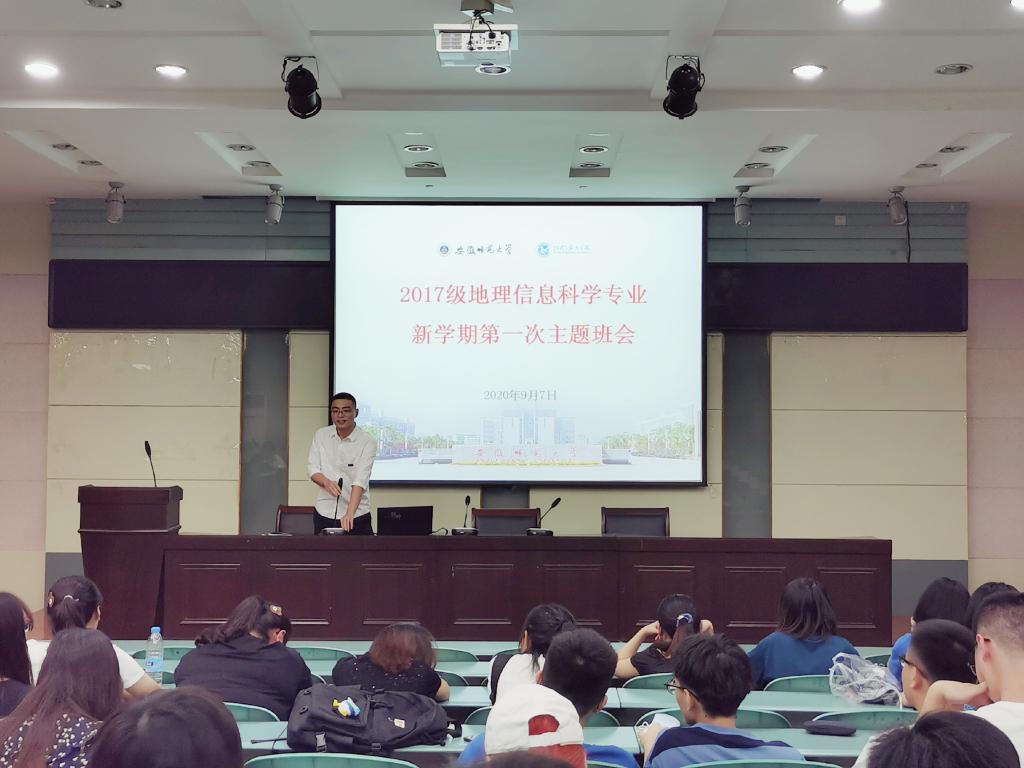 实验楼101报告厅召开了新学期第一次主题班会。班会由辅导员韩红豆主持,2017级地理信息科学专业全体同学参会。
