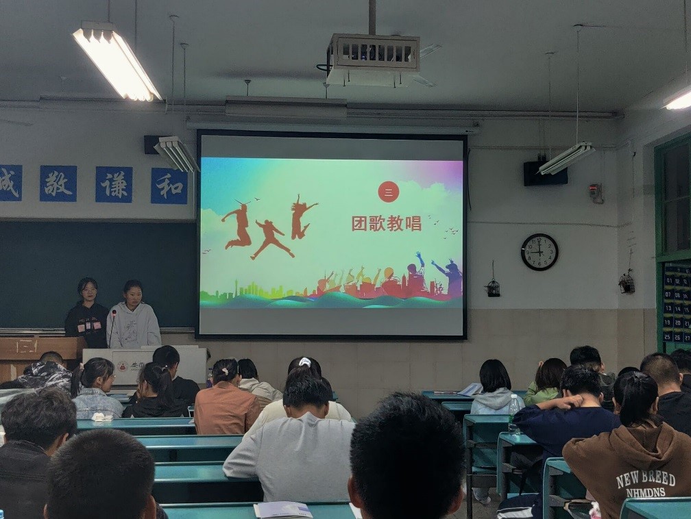 活动进行到第三项,全体同学共同学唱共青团团歌《光荣啊!中国共青团》。“我们是五月的花海,用青春拥抱时代,我们是初升的太阳,用生命点燃未来……”这是中国共青团员朝气的象征,展现了每一位优秀青年有理想、有道德、有文化、有纪律的精神风貌。在场的每位同学用嘹亮的歌声表现出自己作为一名光荣的中国共青团员的自豪感,完美展现出新时代中国青年的蓬勃朝气。
