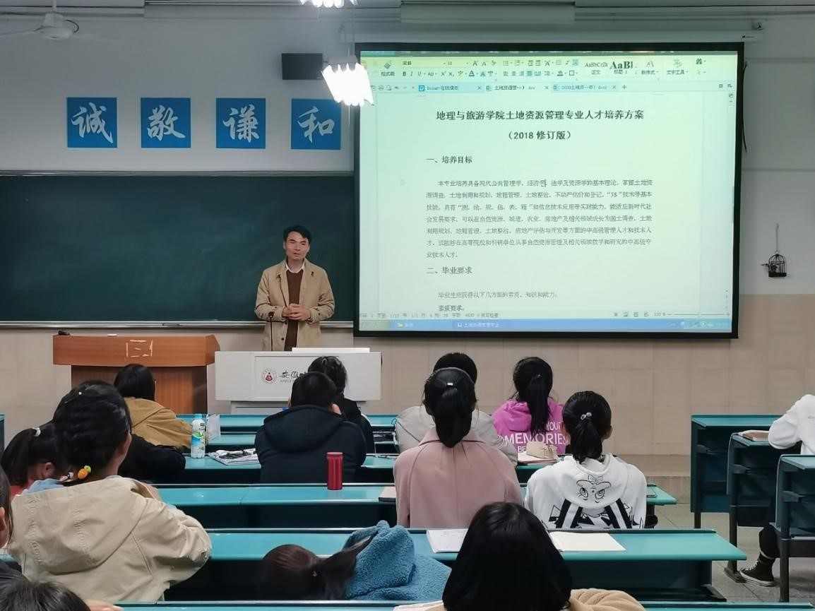 费罗成老师以《人才培养方案》为主线,为同学们详细介绍土地资源管理专业大学四年的课程安排。在讲解人才培养目标时,费老师详细介绍了本专业未来就业方向;在讲解课程计划时,费老师为同学们仔细讲解理论课程和实践课程的课程安排;在讲解毕业要求时,费老师认真解读了素质、知识和能力等方面的具体要求。同学们与费老师积极互动并表达出内心的疑惑与不解,针对同学们提出的一些问题,费老师耐心解答,同学们受益匪浅,最后以热烈的掌声表示对费罗成老师的感谢。