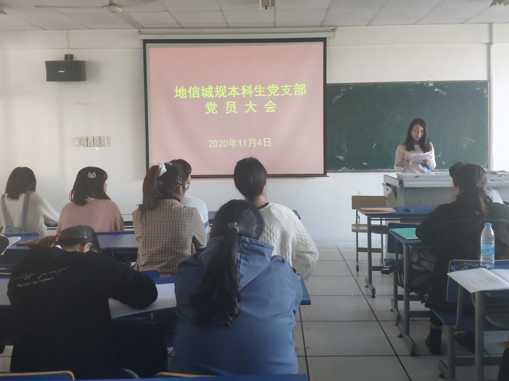 地信城规本科生党支部在学院实验楼201教室召开支部党员大会,会议讨论表决接收预备党员相关事宜。大会应到14人,实到12人,其中有表决权的党员应到8人,实到6人。会议由支部书记彭媛媛主持。