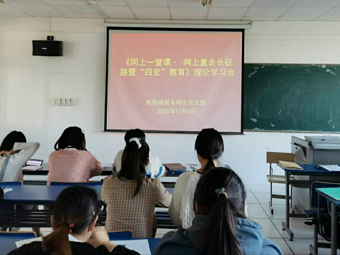 该项议程结束后,为贯彻落实《教育部办公厅印发<关于开展“网上重走长征路”暨推动“四史”学习教育的工作方案>的通知》和9月29日网上重走长征路暨推动“四史”学习教育全国启动仪式会议精神,由支部书记彭媛媛带领全体人员集中观看《同上一堂课·网上重走长征路暨“四史”教育》,发扬传承大别山精神和改革创新思想。