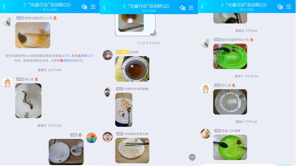 此外,班级还组建了“光盘行动”活动群,鼓励同学们一日三餐在群内进行光盘打卡,形成一股互相影响的软传播力量;引导同学们从节约餐桌上的一饭一菜做起,文明用餐,坚决杜绝“舌尖上的浪费”,做“光盘行动”的示范者、引领者、推动者!据悉,此次光盘打卡时间为11月18日至11月29日,共有8名同学累计打卡十次以上,为表扬她们积极的态度和行为,奖励每人一份暖冬小礼物。