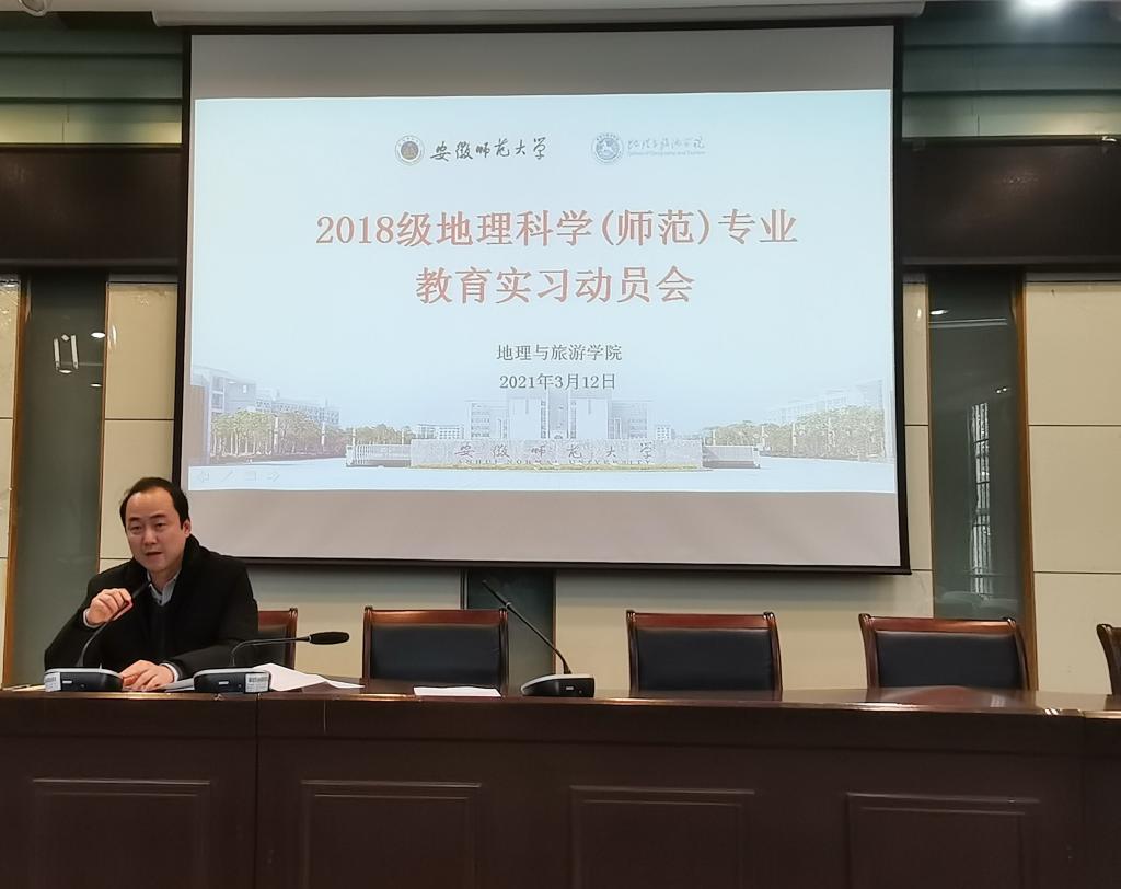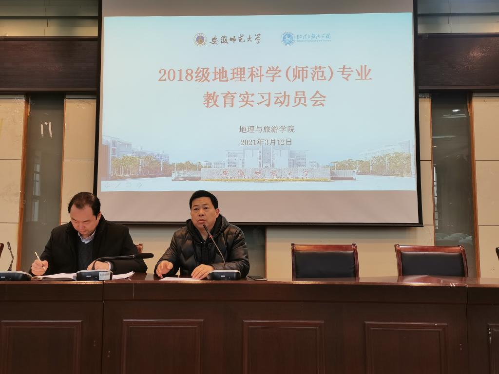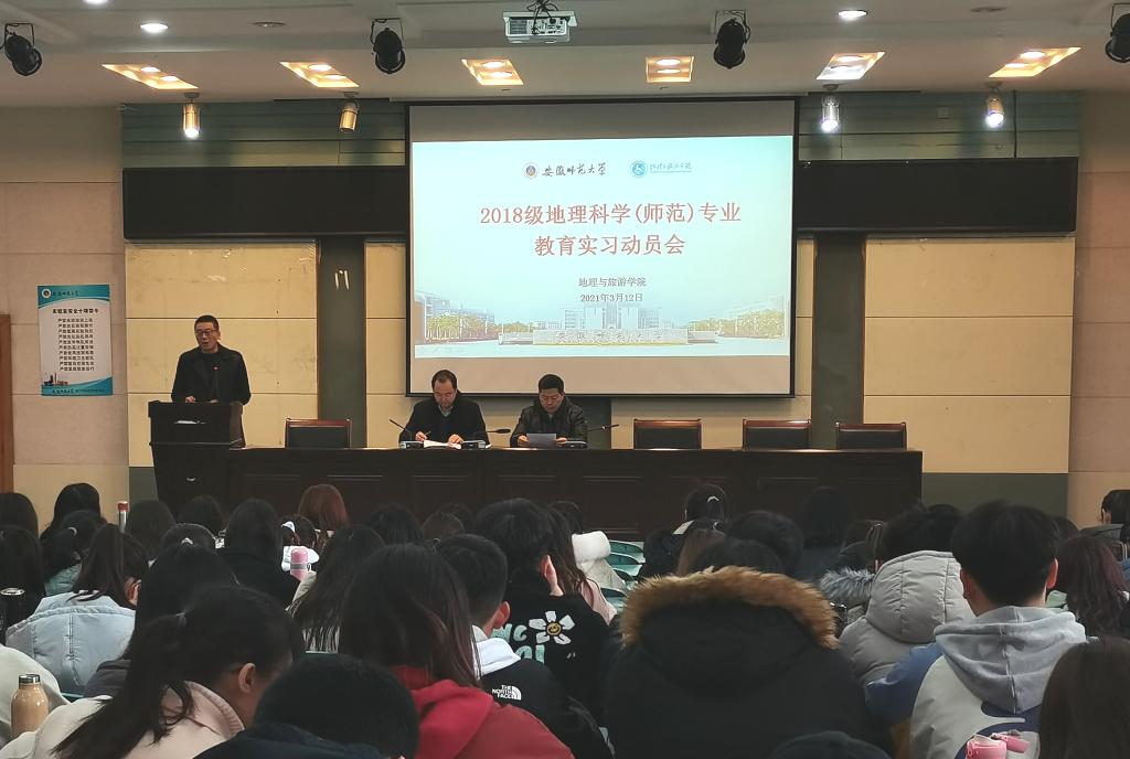 于地旅实验楼101报告厅举行2018级地理科学(师范)专业教育实习动员大会。此次会议由地理专业负责人朱永恒教授主持,教学副院长曹卫东、党委副书记乔静、全体实习指导教师、辅导员丁茹栩出席,2018级地理科学(师范)专业全体同学参加。