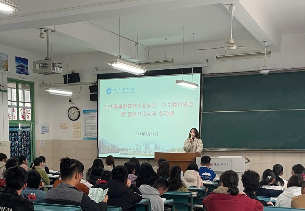赵佳慧 孙云峰)为提高学生安全卫生意识,进一步推进文明宿舍建设和营造舒适健康的学习生活环境,2020级旅游管理专业辅导员赵佳慧于3月16日下午,在4号楼203教室召开了安全卫生教育主题班会暨“爱国卫生运动”劳动课。班会由赵佳慧主持,2020级全体旅游管理专业同学参加。