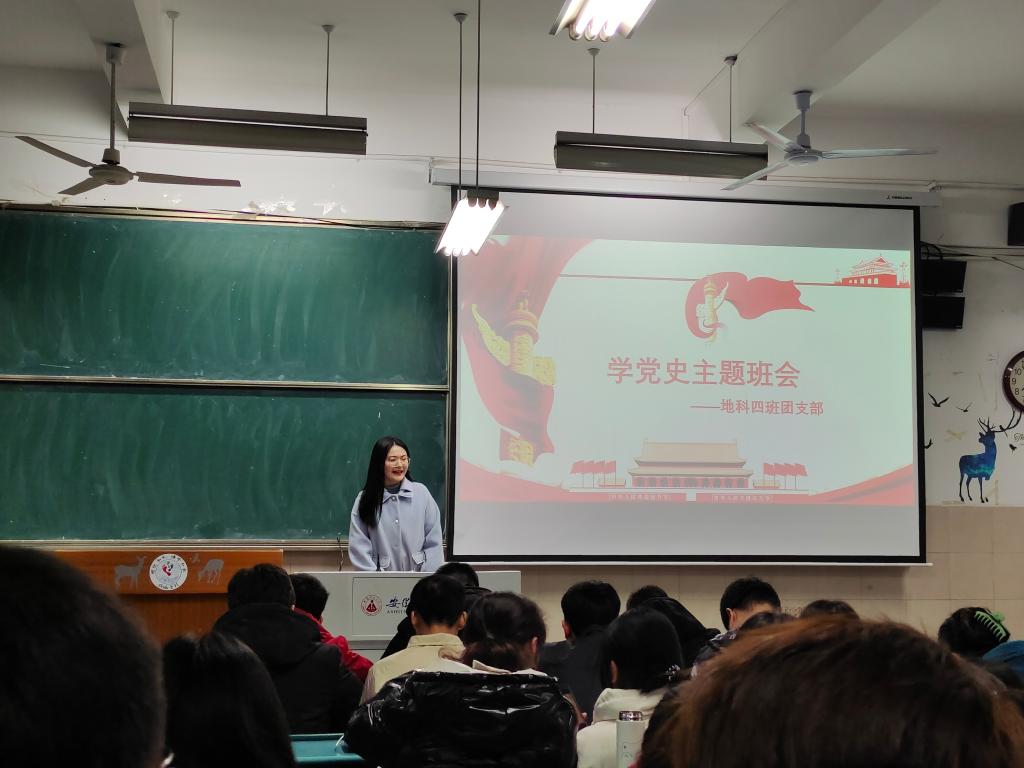本网讯(周亮、张曼其、彭媛媛)为贯彻落实习近平总书记在党史学习教育动员大会上的重要讲话精神,引领广大同学学史明理、学史增信、学史崇德、学史力行,20级地理科学类四班(以下简称地科四班)于2021年3月10日晚,在行知楼2040202教室召开“学党史”主题班会。此次班会由地科四班团支部书记张曼其同学主持,会议内容主要包括:学习中国共产党党史,学习习近平总书记重要讲话,观看献礼纪录片等。