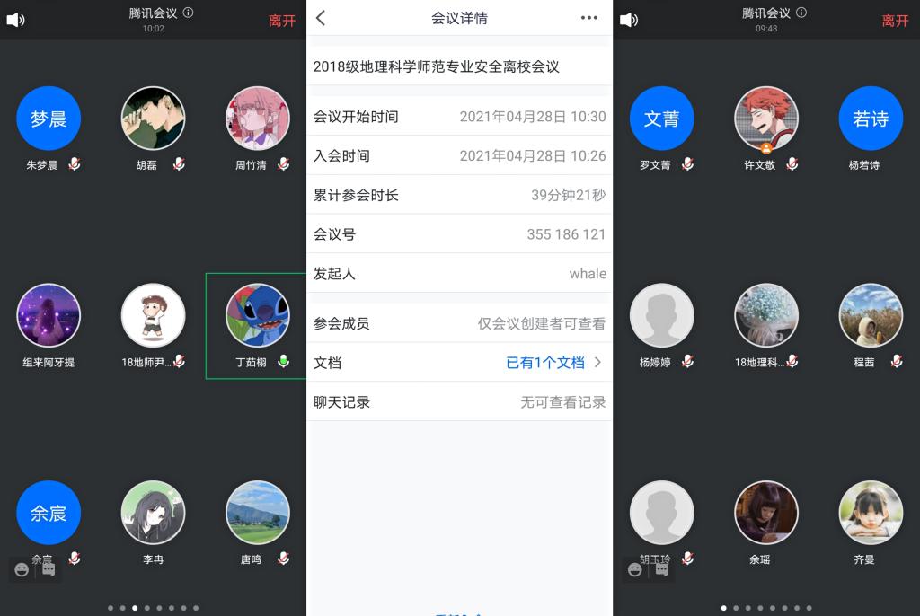 丁茹栩 罗文菁)4月28日上午10点半,为增强同学们的安全意识,2018级地理科学(师范)专业通过网络平台的形式举行五一安全离校会议,此次会议由辅导员丁茹栩主持,2018级地理科学(师范)专业全体成员参加。