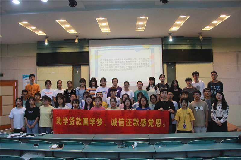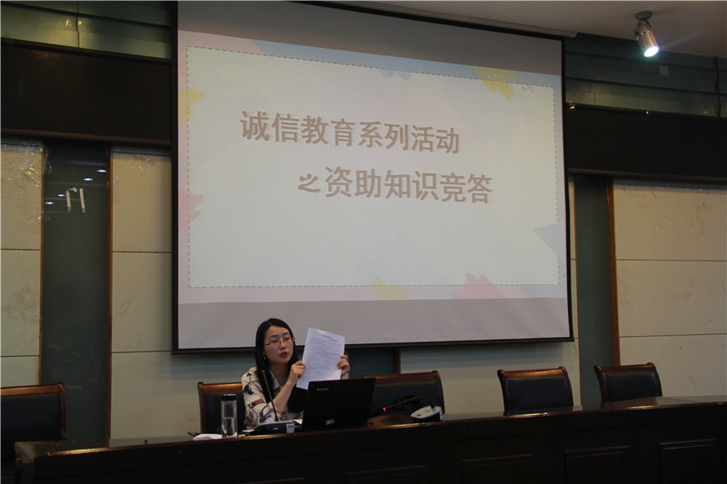 在实验楼101教室开展资助诚信教育系列活动,活动由学院分管学生资助工作的辅导员彭媛媛主持,全体申请助学贷款的学生、各年级各班级家庭经济困难学生代表参会。
