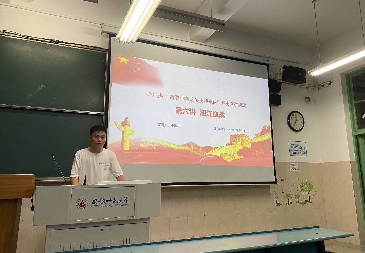 刘少杰 耿艺榕)为全面贯彻落实习近平总书记在党史学习教育动员大会上的重要讲话,积极响应“学史明理、学史增信、学史崇德、学史力行”的号召,推动“学党史、强信念、跟党走”学习教育持续深化,强化爱国主义教育。6月16日晚七点半,2020级城乡规划班“青春心向党 党史我来讲”党史宣讲主题活动第六讲开讲。本次主讲人为入党积极分子王宏志,主题为《湘江血战》。