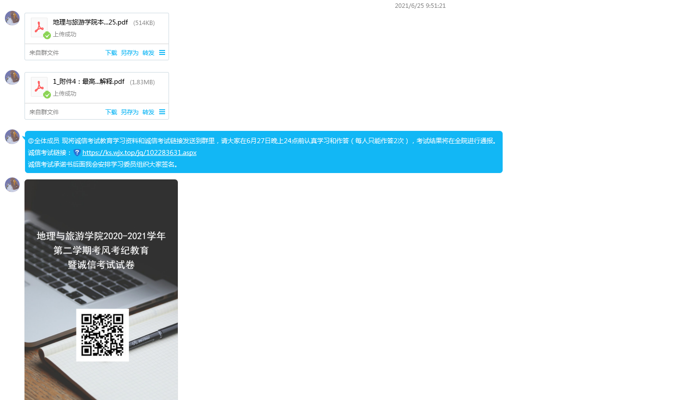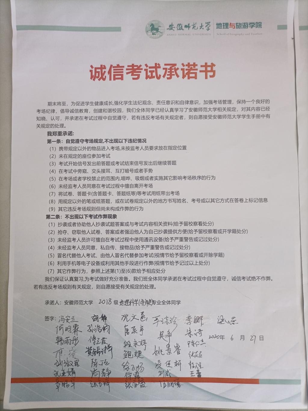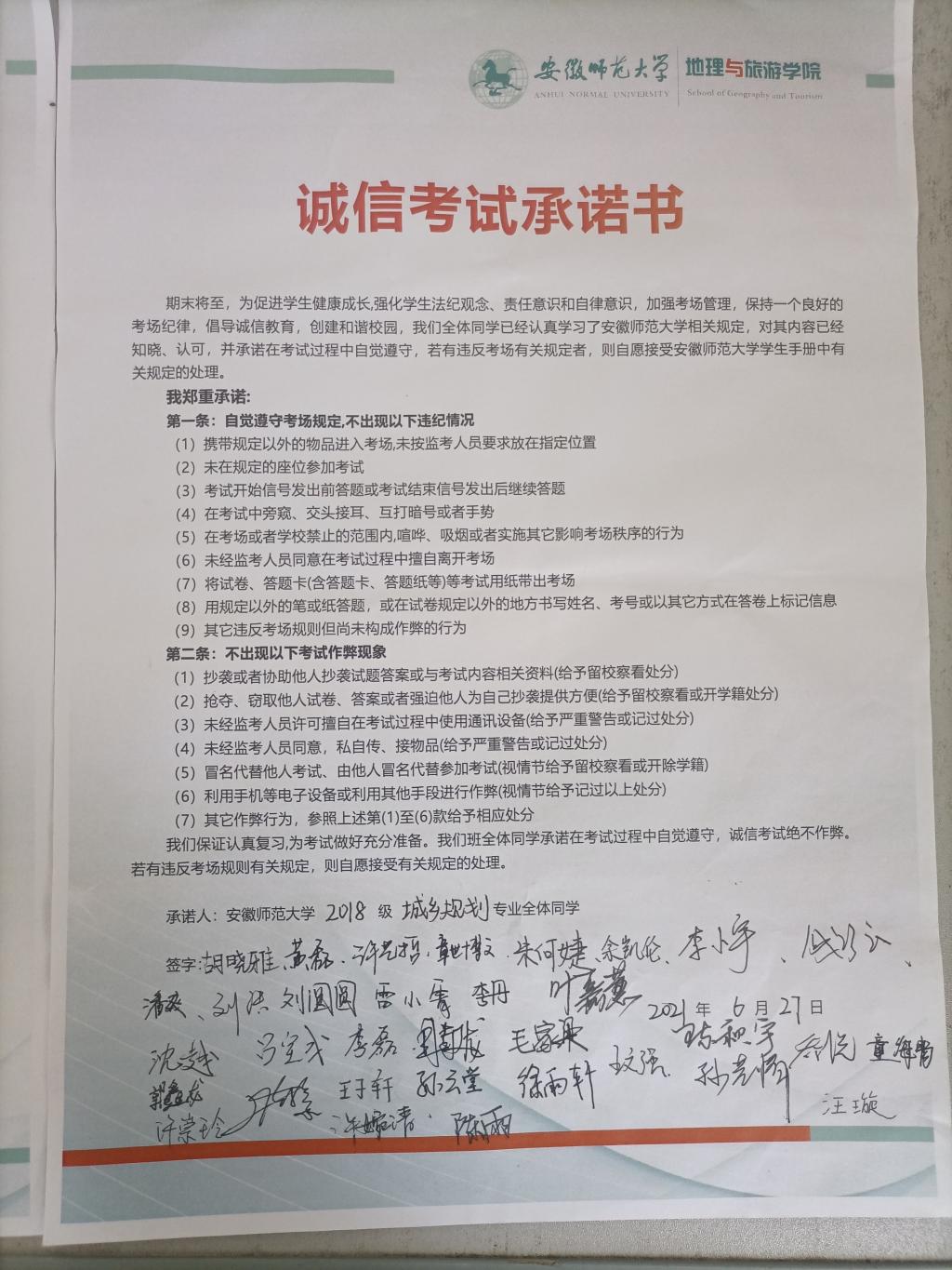 张慧着重强调了考试纪律,提醒同学们认真学习《安徽师范大学学生手册》53—55页内容及群文件中的相关法条,号召同学们严于律己、诚信考试,不做违反校规校纪的事。她还提醒同学们做好复习安排,合理规划,劳逸结合,在复习的同时照顾好身体,考试时要带好考试相关用品,检查无误后再交卷。此外,班级同学还完成了线上诚信考试答题与线下诚信考试承诺书签名。