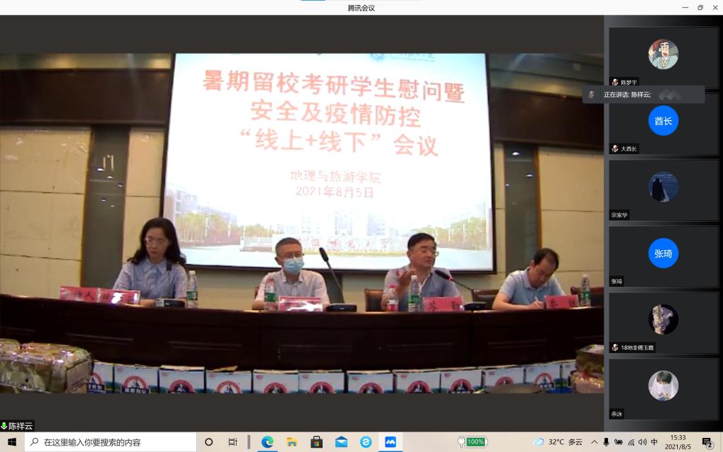 党委书记贾冠忠、院长苏勤、院党委副书记乔静以及2018级本科生辅导员出席会议。会议严格遵守疫情防控规定,采取“线上+线下”的形式,部分暑期留校考研学生代表现场参加会议,其余考研留校学生通过腾讯会议线上参会。会议由院团委书记、2018级本科生辅导员陈祥云主持。