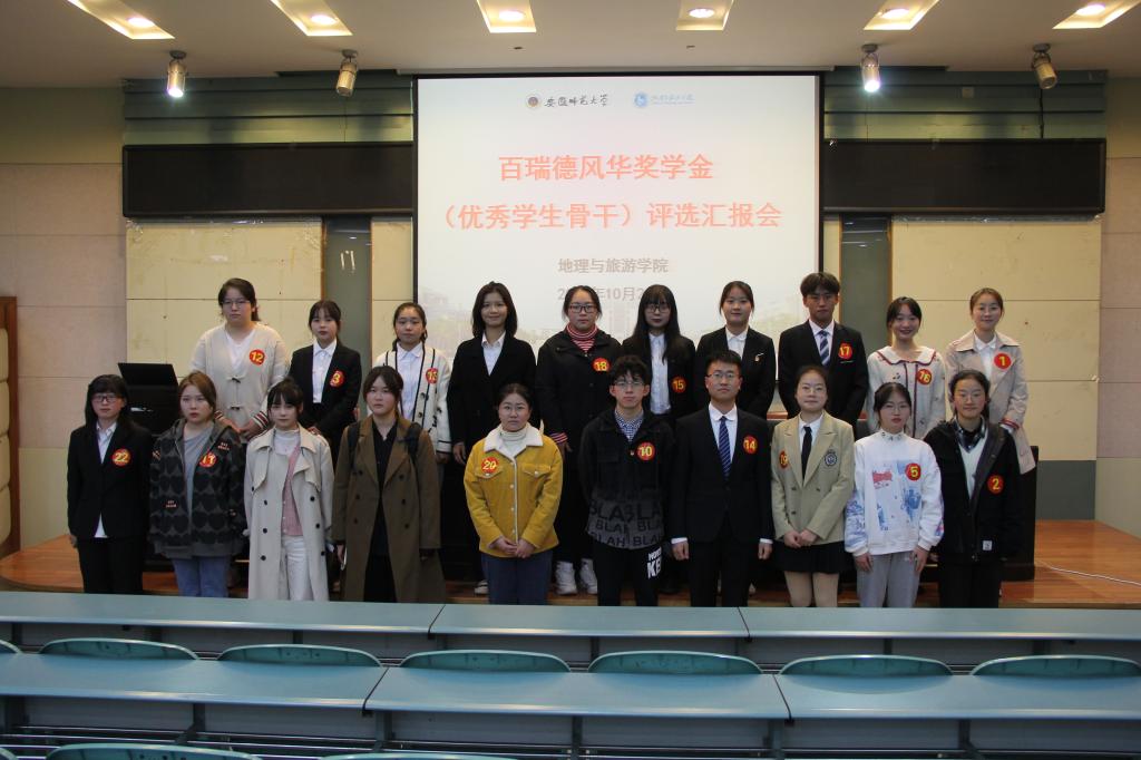 2002级校友程伟在母院设立的社会奖助学金“安徽师范大学百瑞德奖学金”,旨在支持教育事业发展,激励在读本科生勤奋学习、励志成才。其中,“百瑞德风华奖学金”用于奖励帮扶在党支部、团委、学生会、社团、班级等组织中担任学生干部,或在道德风尚、学术研究、学科竞赛、创新发明、社会实践、体育竞赛、文艺比赛等方面成绩特别突出的优秀学生,充分发挥学生骨干在地旅学子中的示范、引领作用,展现“地旅风华”。
