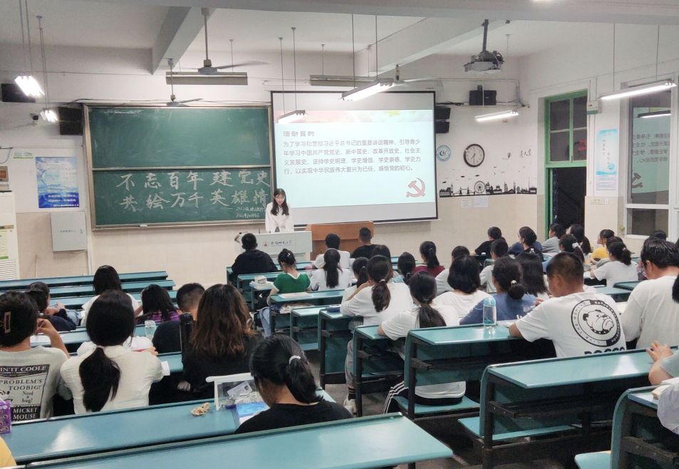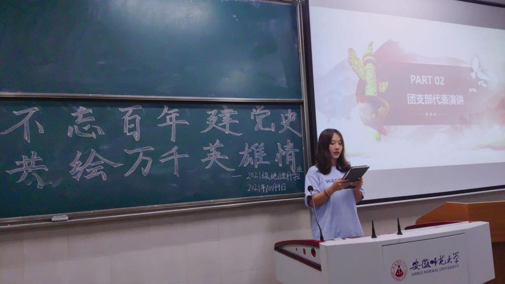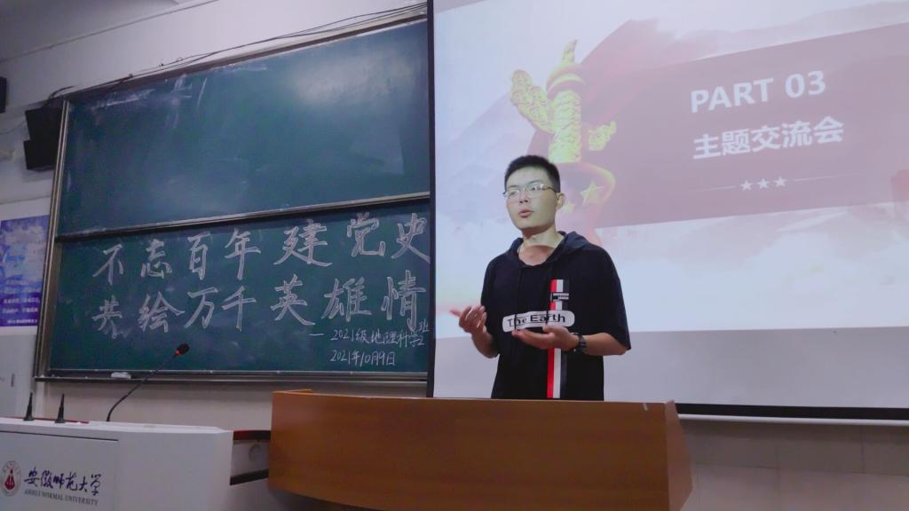 韩红豆 周润)为深入学习习近平总书记“七一”重要讲话精神,激励和引领团员青年时刻牢记总书记嘱托,践行青春使命,10月9日晚,21级地理科学(师范)2班在教学楼2040204开展主题团日活动。本次活动由团支书王彩安同学主持,班级全体同学参加。