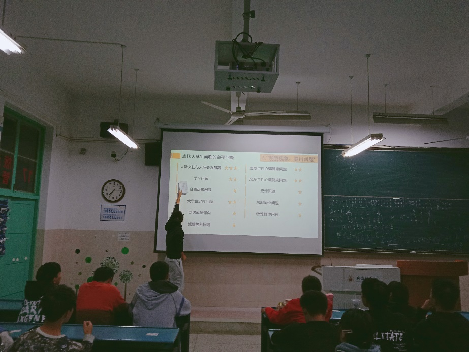第一部分“观察现象,提出问题”。刘鹏程向同学们展示并介绍了大一新生可能会存在的心理问题,并积极与同学互动交流,解答面对该类问题我们应当如何面对。