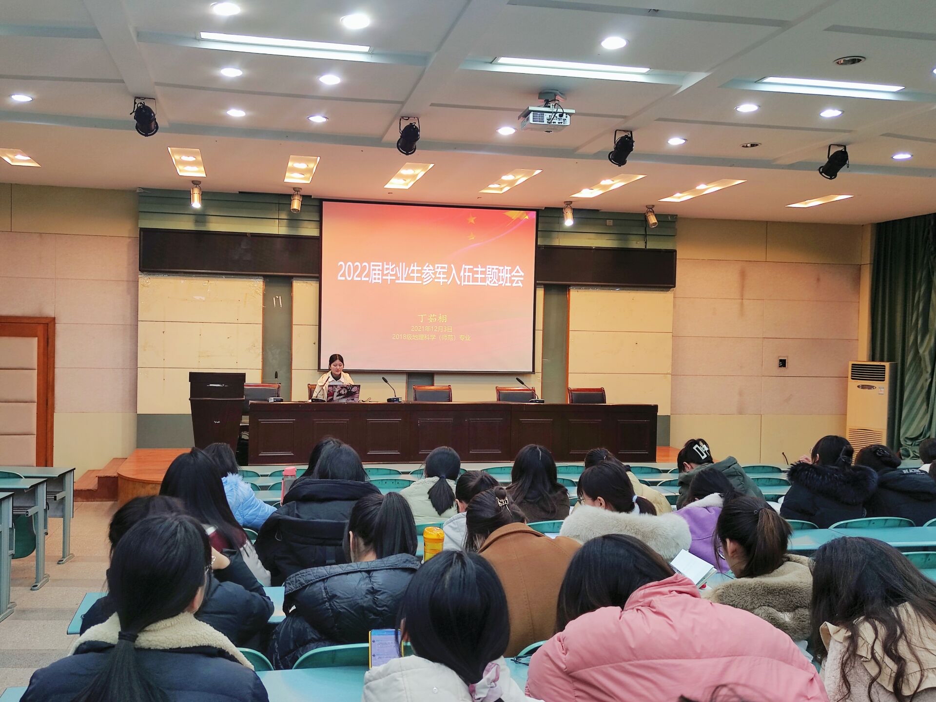 丁茹栩 尹仟仟)为进一步引领和激励高校学子携笔从戎,参军报国建功立业,切实做好2022年春季毕业生应征入伍宣传工作,增进同学们对征兵入伍政策的了解。12月3日,2018级地理科学(师范)专业在院实验楼101报告厅召开2022届毕业生参军入伍主题班会。会议由辅导员丁茹栩主持,2018级地理科学(师范)专业全体同学参与会议。