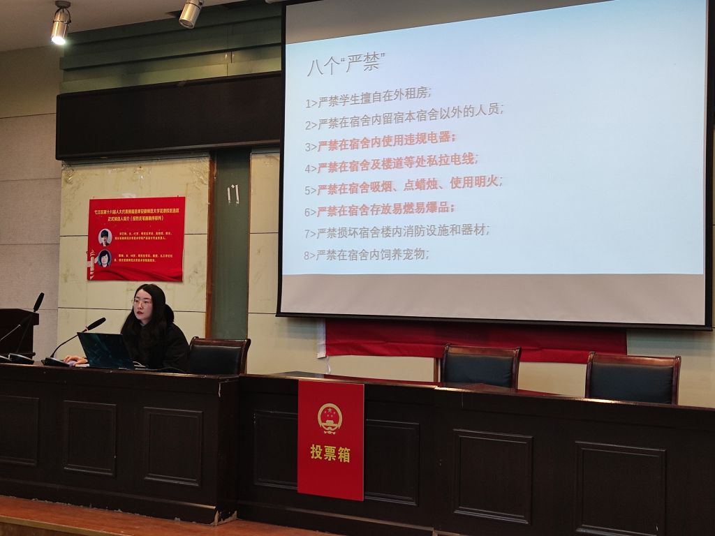 随后,彭媛媛向大家重申学校的四项禁令:“严禁未经批准擅自离校,严禁未经批准私自租房,严禁晚归不归,严禁使用违规电器。”希望同学们能时时刻刻将四项禁令和八个“严禁”牢记于心,坚持人走断电,注意交通安全、用电安全、饮食安全等。希望同学们注意个人安全和疫情防控态势,严格执行防控制度,落实各项疫情防控管理规定,严格执行“晨午晚检”“日报告”“零报告”等制度,做到非必要不出校、非不要不离芜,积极配合学校疫情防控管理,严格请销假制度。