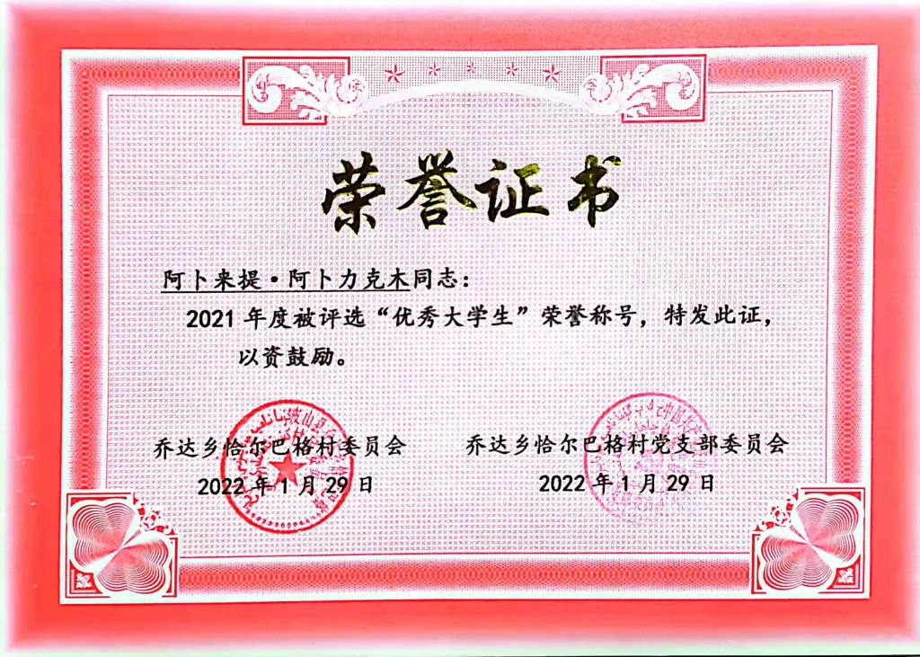 积极响应学校“筑梦暖冬、乐享寒假”大学生寒假社会实践活动的号召,开展各项暖冬活动。来自新疆的阿卜来提·阿卜力克木同学回到家乡新疆和田,积极配合响应当地乡政府和村委会开展工作并参加了多项社会实践活动,在这个寒冬他用自己的切实行动,为家乡作出贡献,获得当地政府表彰。