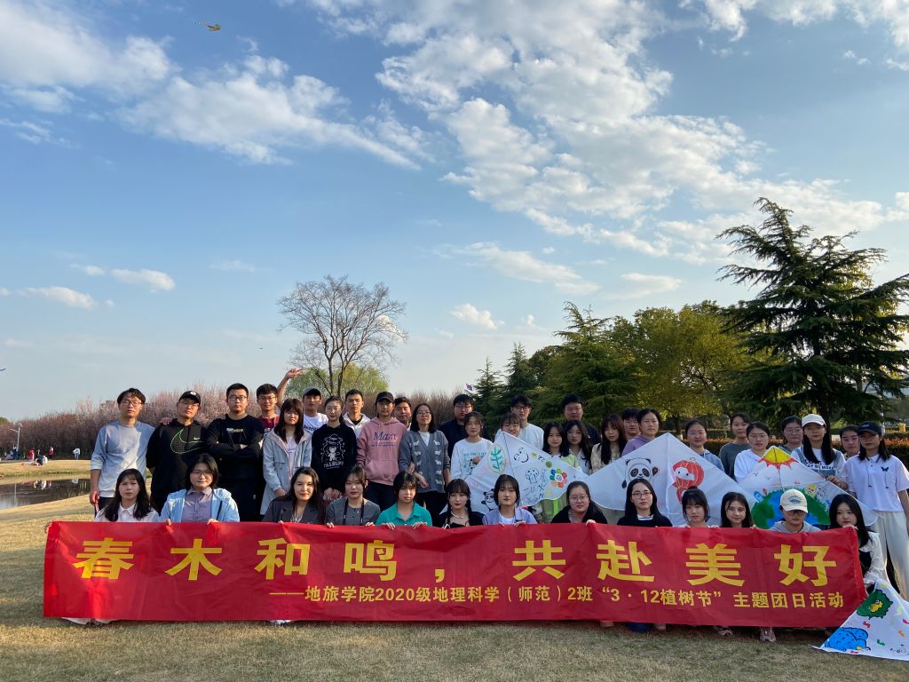 邵宇萌 奎一鸣 彭媛媛)孟春之月,盛德在木。3月12日下午,在第44个植树节来临之际,2020级地师2班全体成员在行知楼东南侧草坪上开展了“春木和鸣,共赴美好”植树节主题团日活动。