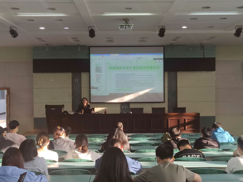 就业政策解读会上,陈祥云领学了教育部高校学生司、教育部学生服务与素质发展中心印发的四张就业相关政策公告海报,分别是普通高校毕业生基层就业政策公告、普通高校学生自主创业政策公告、普通高校学生应征入伍政策公告、普通高校毕业生就业服务公告,带领同学们了解了基层就业、自主创业、应征入伍、就业服务等方面的有关政策,提醒同学们了解掌握政策内容,鼓励同学们积极就业。