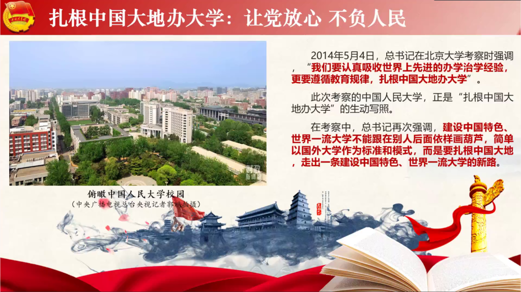 中国人民大学是我们党创办的第一所新型正规大学,历史悠久,具有光荣的革命传统和鲜明的红色基因。2014年5月4日,总书记在北京大学考察时强调“我们要认真吸收世界上先进的办学治学经验,更要遵循教育规律,扎根中国大地办大学。”此次考察的中国人民大学,正是“扎根中国大地办大学”的生动写照。2022年4月25日,习近平总书记专门参观了中国人民大学校史展。他强调,一定要把这一光荣传统和红色基因传承好,守好党的这块重要阵地。