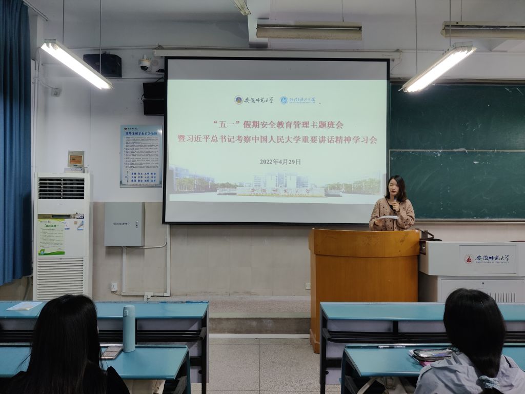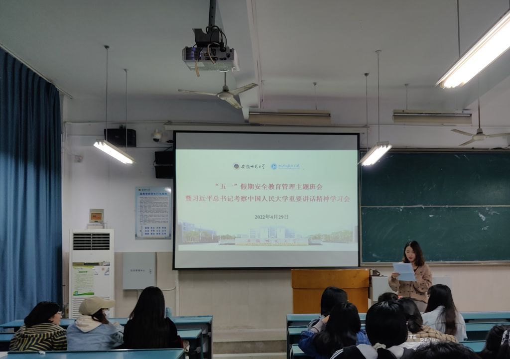 舒玉茹)为在疫情防控常态化下进一步加强学生安全教育,增强学生的安全意识,度过一个健康、文明、安全的“五一”假期,2022年4月29日下午,2020级旅游管理召开“五一”假期安全教育主题班会。班会由辅导员赵佳慧主持,2020级旅游管理全体同学参加。