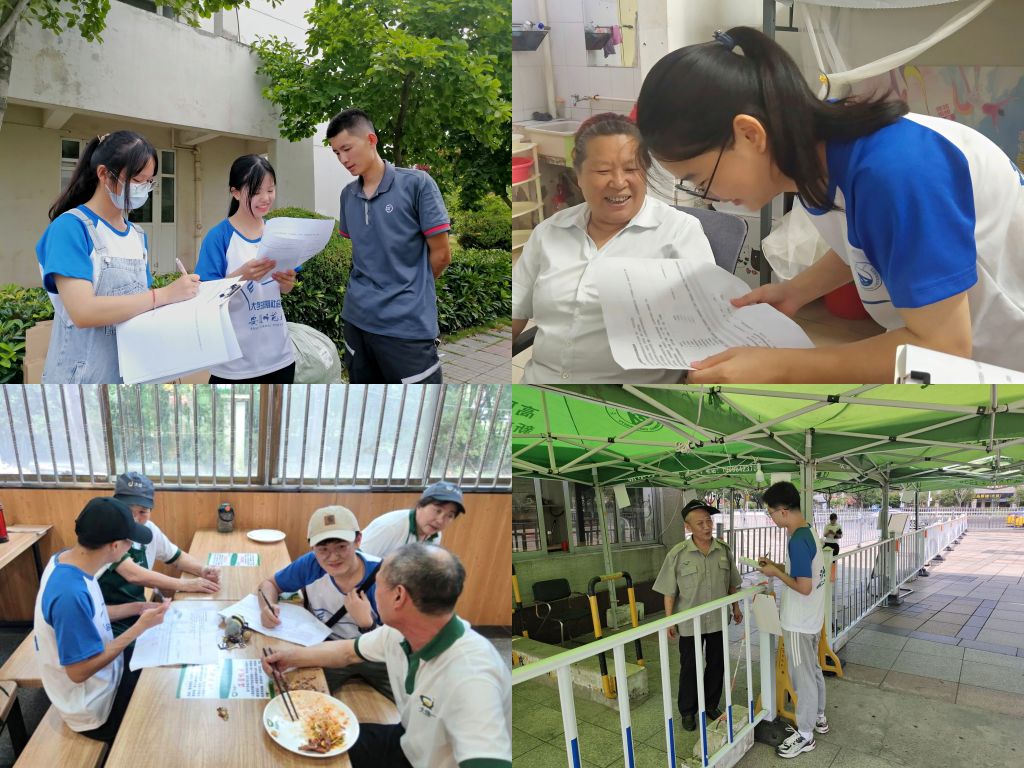傍晚时分,长江边的天空泛起红霞,调研团队一行人来到芜湖市滨江公园中江塔下,开始对江边散步、乘凉的居民进行问卷调查。由于调查对象大部分是60岁以上的老年人,不便于自行填写问卷,于是队员们以聊天的形式向他们询问,细心解读各个问题,协助老人家完成问卷的填写。