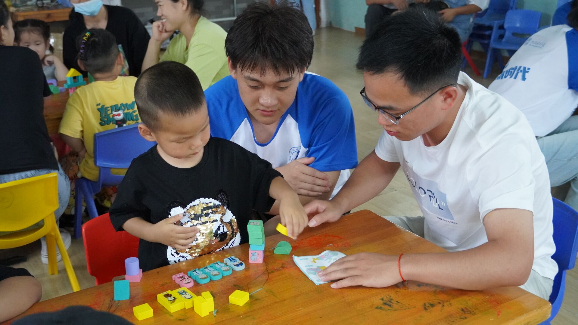 团队指导教师齐小学认真观摩了支教队员为残障儿童授课的过程,并亲自走进教学当中,和队员们一起一对一、手把手地教育引导孩子如何根据颜色、形状进行分类,如何搭出好看的积木作品。虽然积木分类和搭建的教学内容,对于一个正常的孩子来说比较简单,但是对于这群特殊的孩子来说,往往需要重复十遍、二十遍,甚至上百遍才能学会。