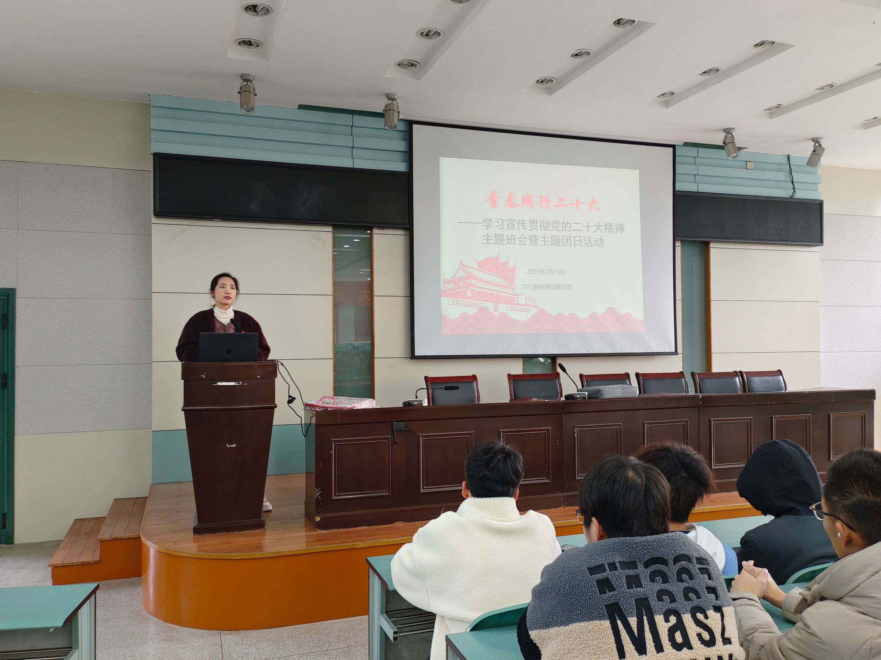 本网讯(魏语菲、陈祥云)2月24日下午,2022级地理信息科学专业一班在实验楼101报告厅开展“青春践行二十大”主题班会暨“我的暖冬故事”寒假社会实践分享会。辅导员陈祥云、2022级地理信息科学一班全体同学参与。